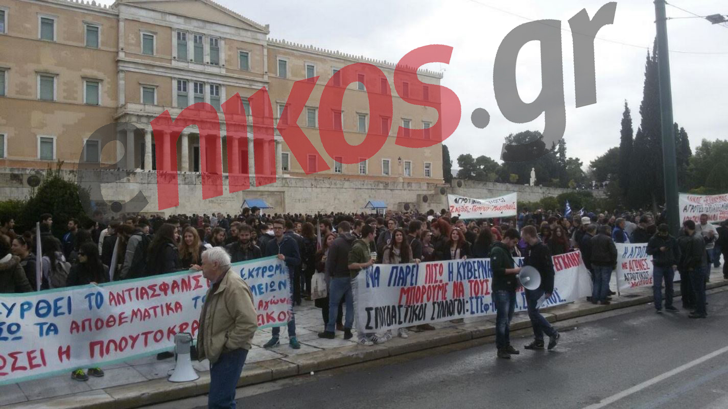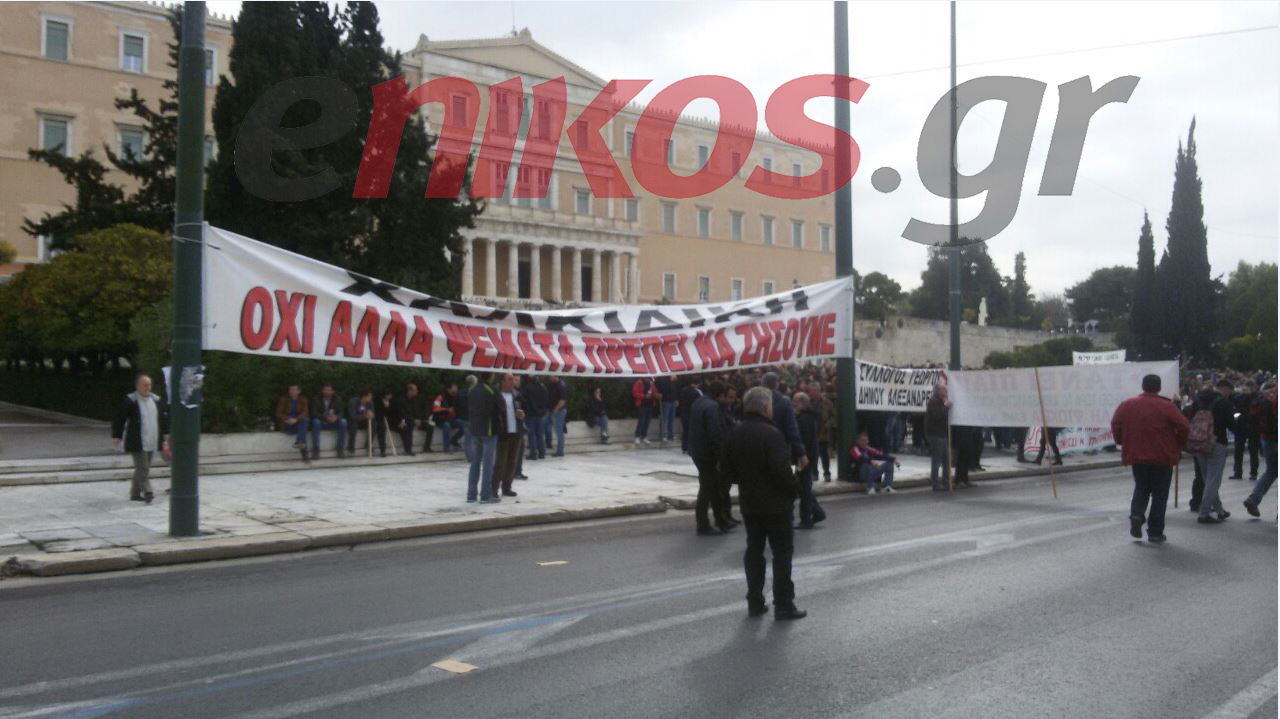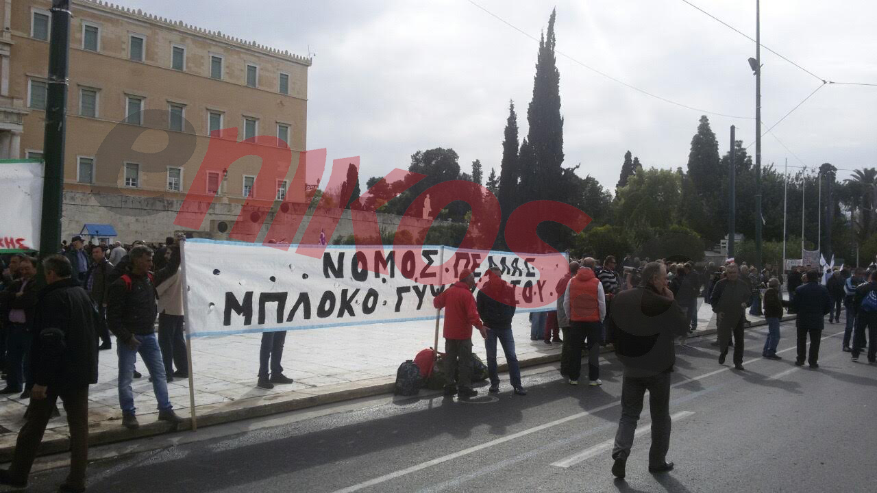 Με σύνθημα «Εργατιά, Αγροτιά, μια φωνή και μια γροθιά» οι συγκεντρωμένοι απαιτούν την απόσυρση του νομοσχεδίου για το ασφαλιστικό προειδοποιώντας για «συνέχιση και κλιμάκωση των κινητοποιήσεων μέχρι τέλους».