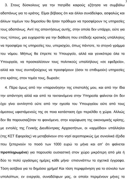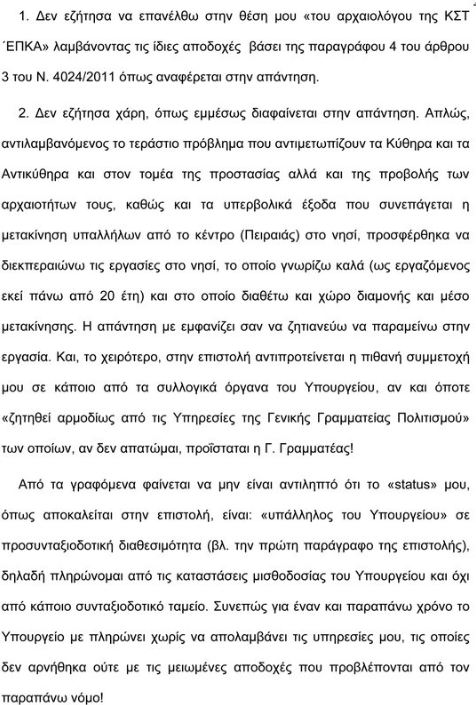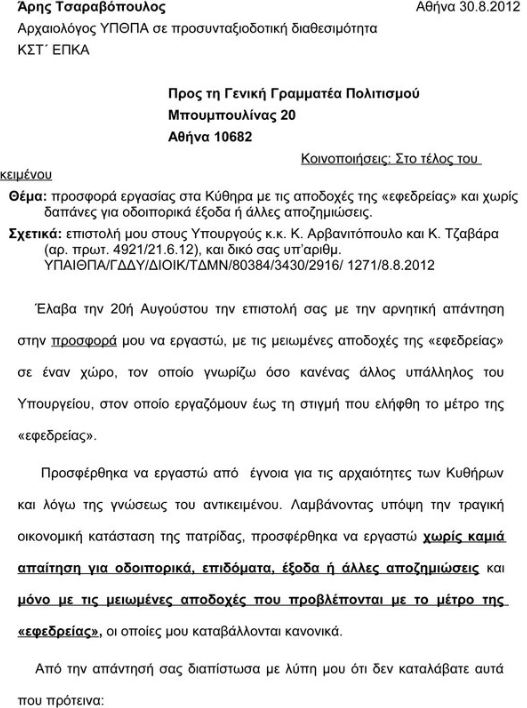 Το υπουργείο Πολιτισμού, αρνείται να δεχθεί την προσφορά του αρχαιολόγου, Άρη Τσαραβόπουλου, να εργαστεί στα Κύθηρα και στα Αντικύθηρα, με τις αποδοχές ”έφεδρου” αρχαιολόγου, όπως αναφέρει ο ίδιος σε επιστολή του προς τη Γενική Γραμματέα Πολιτισμού.Όπως σημειώνει ο αρχαιολόγος δεν του επιτρέπεται καν να πλησιάσει τις αρχαιότητες που έχει ανακαλύψει και μεταφέρει στο Μουσείο.Τονίζει επίσης ότι διευκρίνισε στο υπουργείο πως δεν απαιτεί ούτε αποζημιώσεις ”οδοιπορικών”, ούτε αποζημιώσεις ”εκτός έδρας”, δεδομένου ότι διαθέτει στο νησί και χώρο διαμονής και μέσον μετακίνησης.”Ήδη πολύ πριν υποχρεωθώ σε ”εφεδρεία (που την αποκαλούν με τον νεολογισμό: ”προσυνταξιοδοτική διαθεσιμότητα!”) από όταν παρουσιάστηκαν τα συμπτώματα της κρίσης, από την άνοιξη του 2010, κατανοώντας το μεγάλο πρόβλημα της χώρας και επειδή είχα τη δυνατότητα, δεν διεκδίκησα ούτε οδοιπορικά, ούτε εκτός έδρας, ενώ η παρουσία μου στο νησί ήταν σχεδόν καθημερινή και η προβολή των αρχαιοτήτων των νησιών στο τοπικό και ευρύτερο κοινό ήταν ��υνεχής, προβάλλοντας διαρκώς το έργο της Αρχαιολογικής Υπηρεσίας”, αναφέρει χαρακτηριστικά ο αρχαιολόγος, Άρης Τσαραβόπουλος. Διαβάστε την επιστολή του αρχαιολόγου, Άρη Τσαραβόπουλου