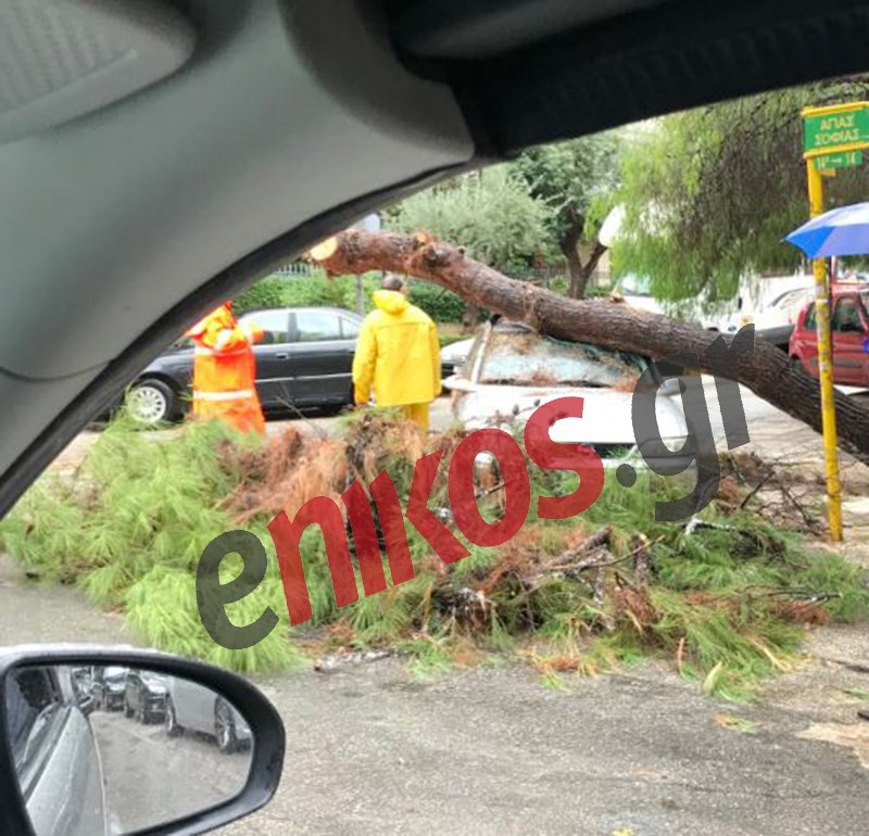 Ένα δέντρο έπεσε πάνω σε αυτοκίνητο στη Νέα Σμύρνη, λόγω της σφοδρής κακοκαιρίας που πλήττει όλη τη χώρα.