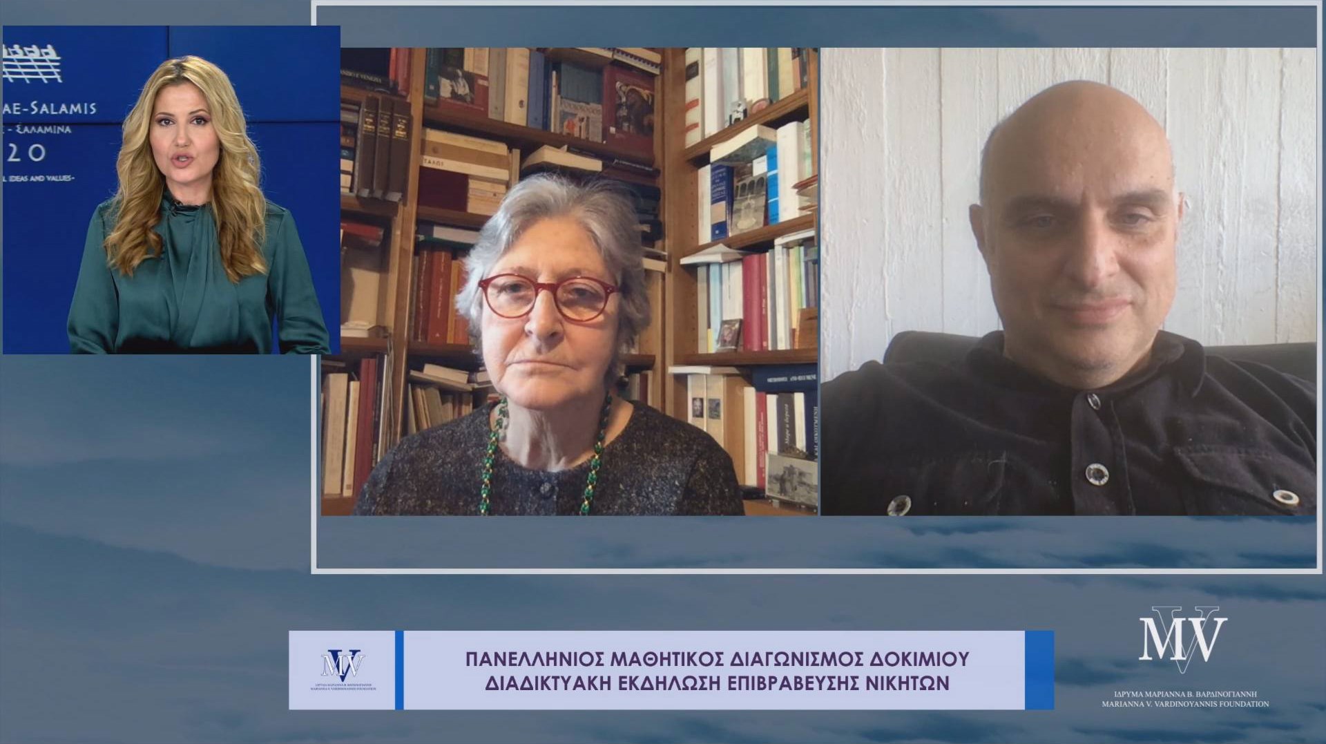 «Αγαπητοί βραβευθέντες μαθητές, με πρωτοβουλία του «Ιδρύματος Μαριάννα Βαρδινογιάννη» και μάλιστα με πρωτοβουλία της ίδιας της κυρίας Βαρδινογιάννη αποφασίστηκε να φτάσει ο διαγωνισμός για τα 2500 χρόνια από το κοσμοϊστορικό γεγονός της Μάχης των Θερμοπυλών και τη Ναυμαχία της Σαλαμίνος στα σχολεία και να διαγωνιστούν οι μαθητές. Έτσι έγινε με τη βοήθεια του Υπουργείου Παιδείας και, παρά τις δυσμενείς συνθήκες της πανδημίας και της τηλεκπαίδευσης, ένας μεγάλος αριθμός μαθητών συμμετείχε και έτσι έφτασε στην Επιτροπή μας ένας αριθμός κειμένων και μπορέσαμε να ξεχωρίσουμε τα τρία κείμενα, τα δικά σας, τα οποία και βραβεύσαμε. Κείμενα δυνατά, κείμενα καλογραμμένα, κείμενα με έμπνευση με διαφορετική προσέγγιση το καθένα του θέματος, που διευκόλυνε κι εμάς τους αξιολογητές δηλαδή τέσσερις πανεπιστημιακούς καθηγητές, τον Καθηγητή της Αρχαίας Ιστορίας στο Πανεπιστήμιο Αθηνών κύριο Κ. Μπουραζέλη, την Καθηγήτρια Ιστορίας και Ακαδημαϊκό κυρία Χ. Μαλτέζου, τον Καθηγητή της Κλασσικής Φιλολογίας κύριο Α. Παπαθωμά, την Εποπτρια των Αρσακείων Σχολείων κυρία Β. Παπαπέτρου κι εμένα ως Καθηγητή Γλωσσολογίας του Πανεπιστημίου Αθηνών. Καθίσαμε, λοιπόν, αξιολογήσαμε αυτά τα κείμενα και με ενθουσιασμό ξεχωρίσαμε τα τρία δικά σας κείμενα τα οποία μάλιστα χωρίς να το επιδιώξουμε είναι από διαφορετικές περιοχές, από τη Μακεδονία, από τη Δυτική Ελλάδα και από την Κρήτη. Αγαπητοί μαθητές, σας αξίζουν συγχαρητήρια! Τα κείμενα σας έδειξαν ότι έχετε μία δυνατή σκέψη, μια πρωτοτυπία και μία πραγμάτευση του θέματος που ήταν διαφορετική από τους τρεις σας. Σας συγχαίρουμε και σας εύχομαι εκ μέρους της Επιτροπής να έχετε πάντοτε τέτοιες επιτυχίες και να πηγαίνετε πάντοτε μπροστά! Θερμά συγχαρητήρια και σε εσάς, κυρία Βαρδινογιάννη, και στο Ίδρυμα κι ευχαριστίες στο Υπουργείο Παιδείας».