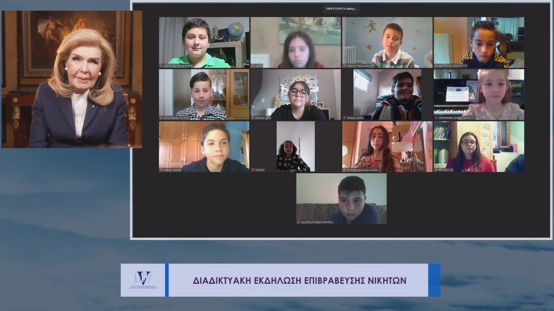 «Αγαπημένα μου παιδιά, θα ήθελα να σας εκφράσω ένα μεγάλο ευχαριστώ για τη συμμετοχή σας και τα πιο θερμά συγχαρητήριά μου για τη διάκρισή σας αυτή. Η συμμετοχή σας, μέσα στις αντίξοες συνθήκες της πανδημίας, στέλνει ένα ακόμα πιο δυνατό μήνυμα αισιοδοξίας και ελπίδας σε κάθε γωνιά της Ελλάδας, ενώ γεμίζει με καμάρι κάθε έναν που διαβάσει τα κείμενά σας. Κείμενα τα οποία μέσα από τον Επετειακό Τόμο, που εκδώσαμε, ταξίδεψαν σε ολόκληρη την Ελλάδα και το εξωτερικό, σε ηγέτες χωρών, σε προσωπικότητες, σε σχολεία, φορείς, στις μεγαλύτερες βιβλιοθήκες του κόσμου, και έστειλαν το μήνυμα της νέας γενιάς της πατρίδας μας με τον πιο ξεχωριστό τρόπο. Το μήνυμα για ένα κόσμο ειρήνης, θεμελιωμένο σε αξίες όπως η ελευθερία, η δημοκρατία, η ομοψυχία, η γενναιότητα. Τα διπλώματα, ο Επετειακός Τόμος και τα αναμνηστικά που κρατάτε στα χέρια σας, ελπίζουμε να σας θυμίζουν για πάντα αυτή την Επέτειο και αυτή σας την επιτυχία που εύχομαι να γίνει κίνητρο και για πολλές ακόμα επιτυχίες στη ζωή και στην πρόοδό σας! Και μάλιστα θα ήθελα να σας ενημερώσω πως τα ταξίδια και οι επισκέψεις στα μουσεία, στο Λονδίνο, το Παρίσι και τη Ρώμη, που είχαμε αρχικά ανακοινώσει ως βραβεία για τους τρεις νικητές, θα γίνουν όταν τελειώσει ο συναγερμός της πανδημίας! Ιδιαίτερες ευχαριστίες θα ήθελα να απευθύνω στο Υπουργείο Παιδείας και Θρησκευμάτων και την Υπουργό κυρία Νίκη Κεραμέως για την πολύτιμη συνεργασία μας καθώς και στην Υφυπουργό κυρία Ζέττα Μακρή που μας τιμά σήμερα με την παρουσία της. Ευχαριστώ θερμά την Ειδική Επιστημονική Επιτροπή Αξιολόγησης των δοκιμίων που αποτελείτο από εξέχοντα μέλη της ακαδημαϊκής και εκπαιδευτικής κοινότητας. Με χαρά τους υποδεχόμαστε σήμερα! Επίσης θα ήθελα να συγχαρώ τους εκπαιδευτικούς και τους γονείς σας που στέκονται δίπλα σας άγρυπνοι συμπαραστάτες στις προσπάθειές σας. Αγαπημένα μου παιδιά, και πάλι, μέσα από την καρδιά μου ένα μεγάλο «Μπράβο»! Μας κάνετε πραγματικά υπερήφανους! Να έχετε πάντα υγεία και πάντα να αριστεύετε στη ζωή σας!»