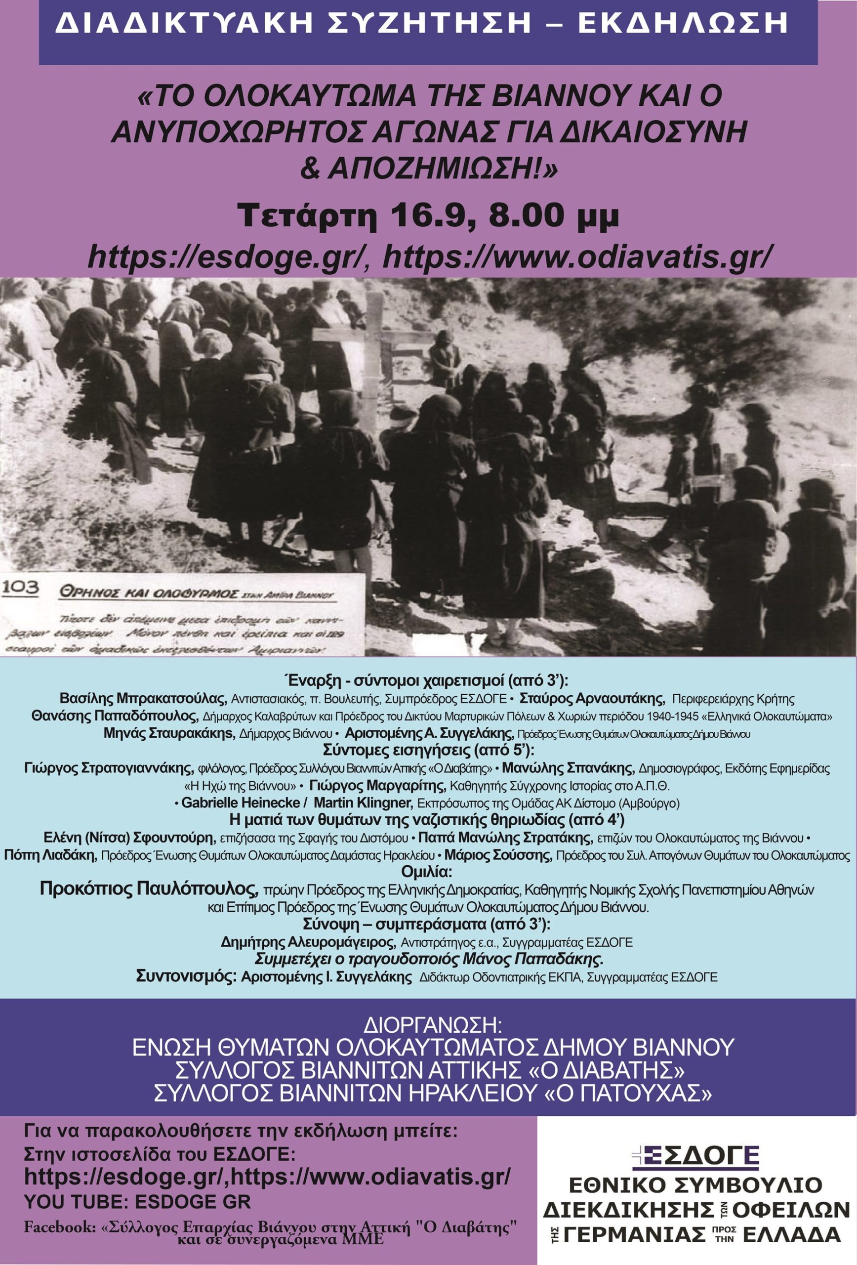 Με βάση τα παραπάνω και για να αποδοθεί η δέουσα τιμή στα θύματα του Ολοκαυτώματος της Βιάννου και συνολικά στα θύματα της ναζιστικής θηριωδίας στην Ελλάδα διοργανώνεται διαδικτυακή εκδήλωση – συζήτηση με τίτλο: «Το Ολοκαύτωμα της Βιάννου και ο ανυποχώρητος αγώνας για Δικαιοσύνη και Αποζημίωση» με τη συμμετοχή εξαιρετικά σημαντικών ομιλητών.