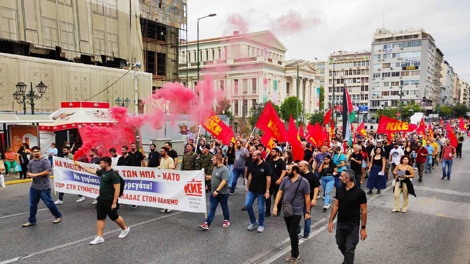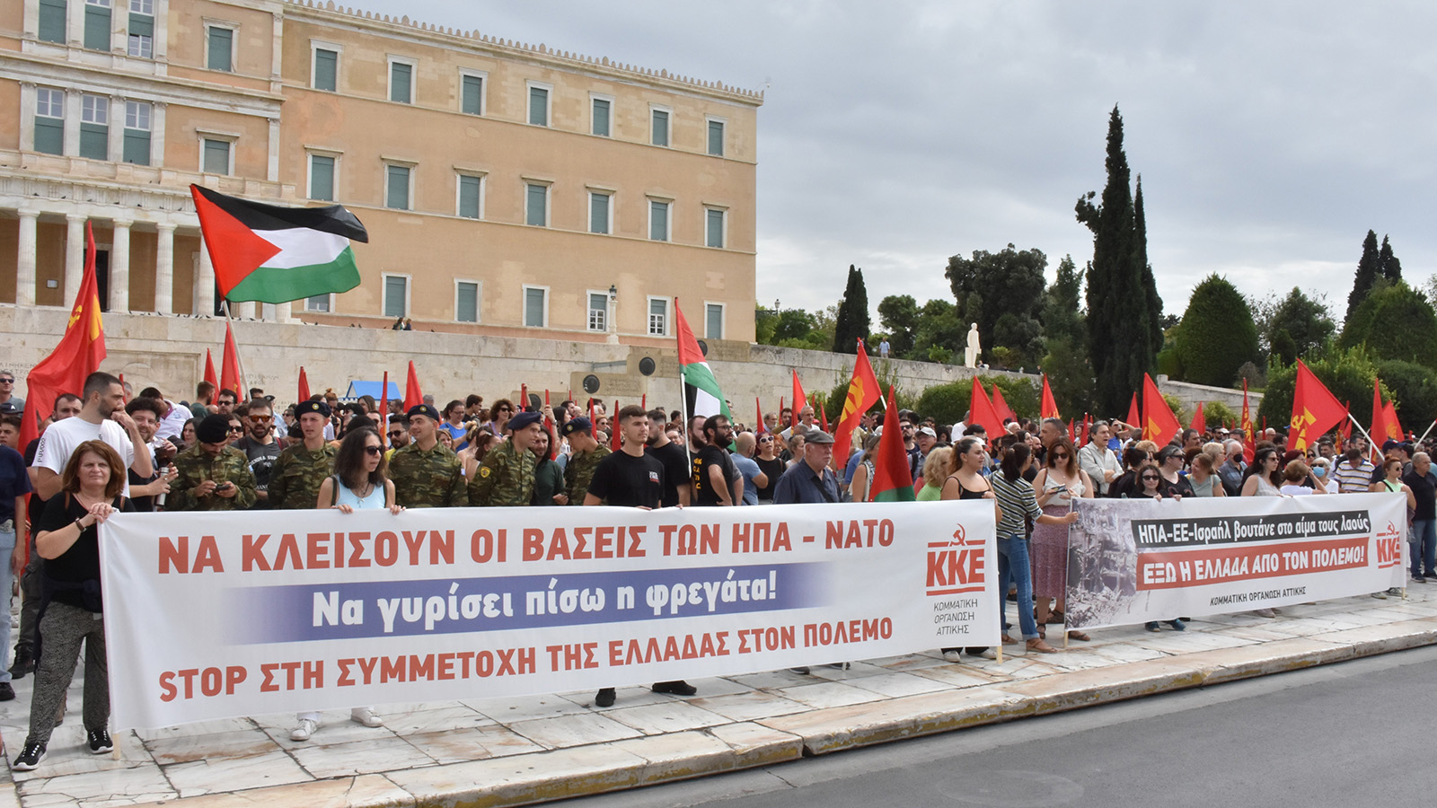 Με αφετηρία της διαδήλωσης την Ομόνοια ακολούθησε πορεία που κατέληξε έξω από τη Βουλή στην κεφαλή της οποίας βρισκόταν τα πανό της Κομματικής Οργάνωσης Αττικής του ΚΚΕ με τα συνθήματα «Να κλείσουν οι βάσεις των ΗΠΑ-ΝΑΤΟ – Να γυρίσει πίσω η φρεγάτα! – Stop στην συμμετοχή της Ελλάδας στον πόλεμο» και «ΗΠΑ-ΕΕ-Ισραήλ βουτάνε στο αίμα τους λαούς-Έξω η Ελλάδα από τον πόλεμο!».