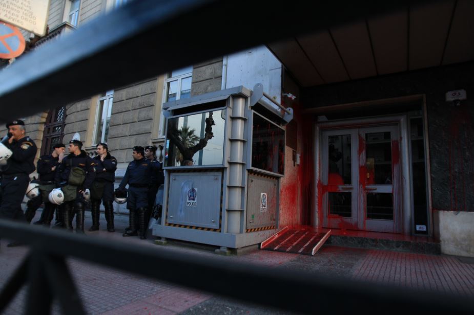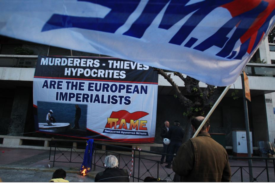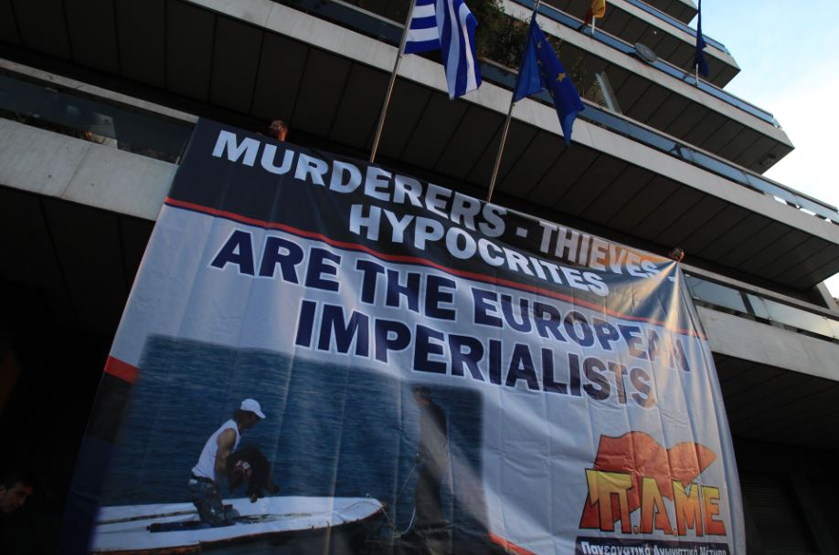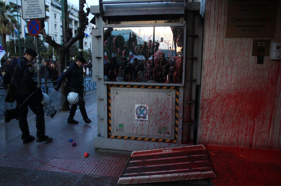 Διαδηλωτές του ΠΑΜΕ πέταξαν μπογιές στην είσοδο του κτιρίου της Ευρωπαϊκής Επιτροπής στη Βασιλίσσης Σοφίας, κατά τη διάρκεια πορείας διαμαρτυρίας για τον θάνατο περίπου 1000 μεταναστών την τελευταία εβδομάδα στη θάλασσα της Μεσογείου.