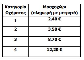 Ειδικότερα, κατά τη διάρκεια της διακοπής της κυκλοφορίας στην Κοιλάδα των Τεμπών, οι τιμές διοδίων του Σταθμού Διοδίων Μοσχοχωρίου – μόνο για την πληρωμή με μετρητά – θα διαμορφωθούν ως εξής: