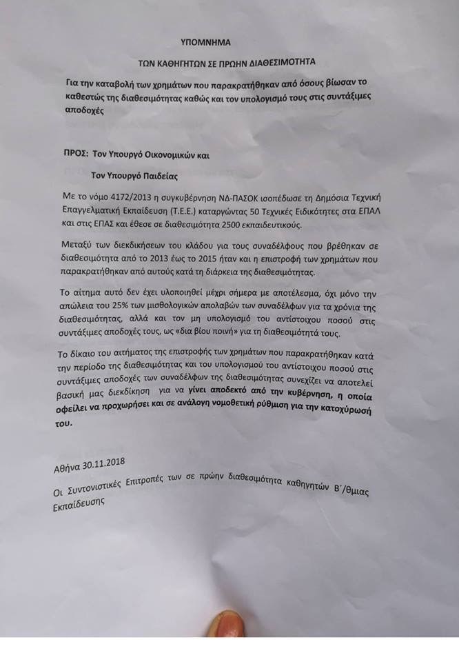 Βασικό αίτημά τους είναι η άμεση καταβολή των χρημάτων που παρακρατήθηκαν από όσους βίωσαν το καθεστώς της διαθεσιμότητας και ο υπολογισμός τους στις συντάξιμες αποδοχές τους.