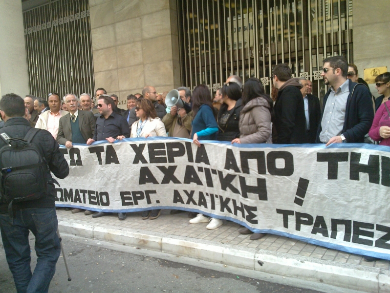 Στον αποκλεισμό του υποκαταστήματος της Τράπεζας της Ελλάδος στην Πάτρα προέβησαν οι εργαζόμενοι της Αχαϊκής Τράπεζας σήμερα το πρωί. Στο πλευρό τους ο Δήμαρχος της Πάτρας Γιάννης Δημαράς, βουλευτές και φορείς της πόλης. Οι εργαζόμενοι φώναζαν συνθήματα και κατήγγειλαν το έγκλημα που έγινε για την οικονομική ζωή της πόλης.