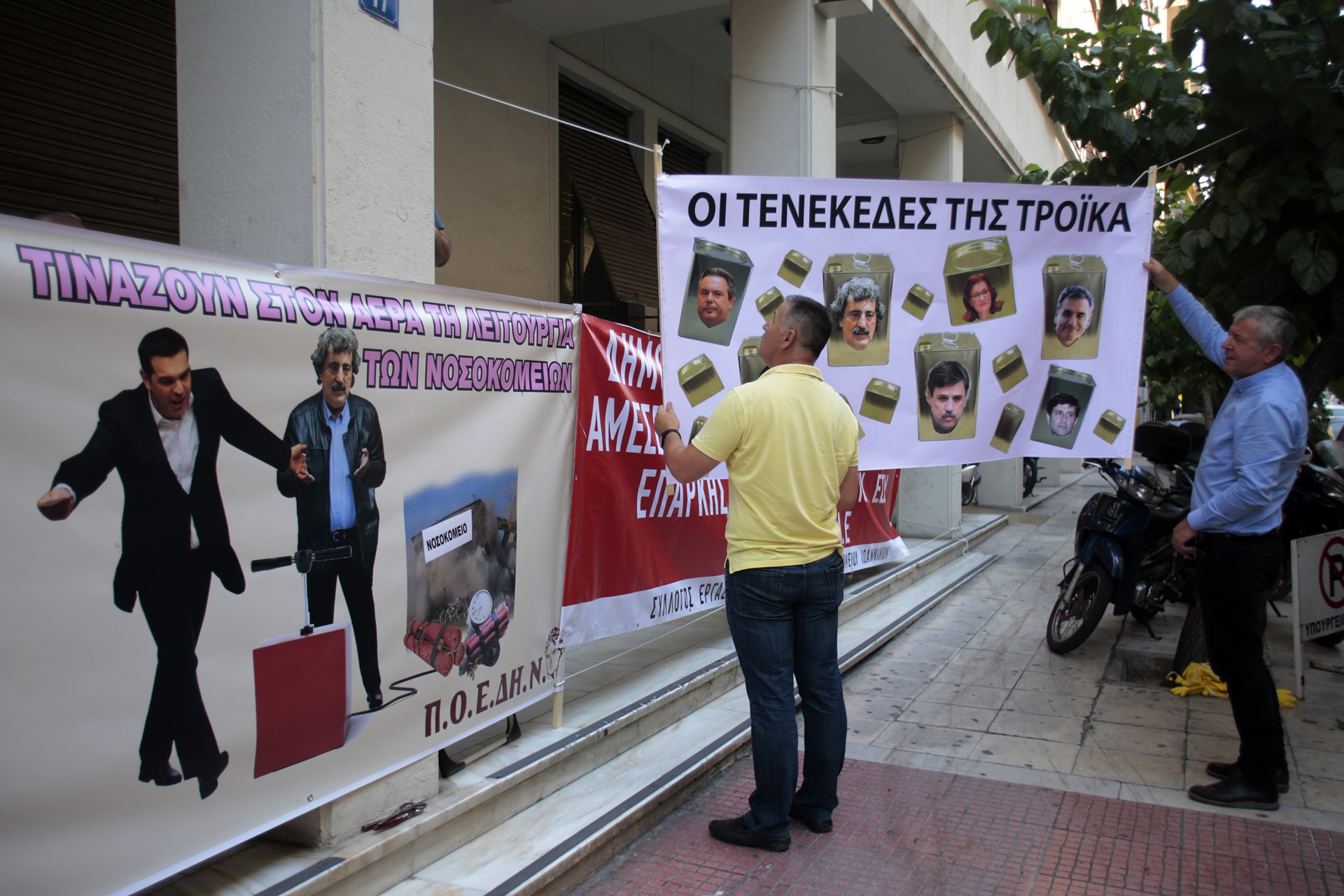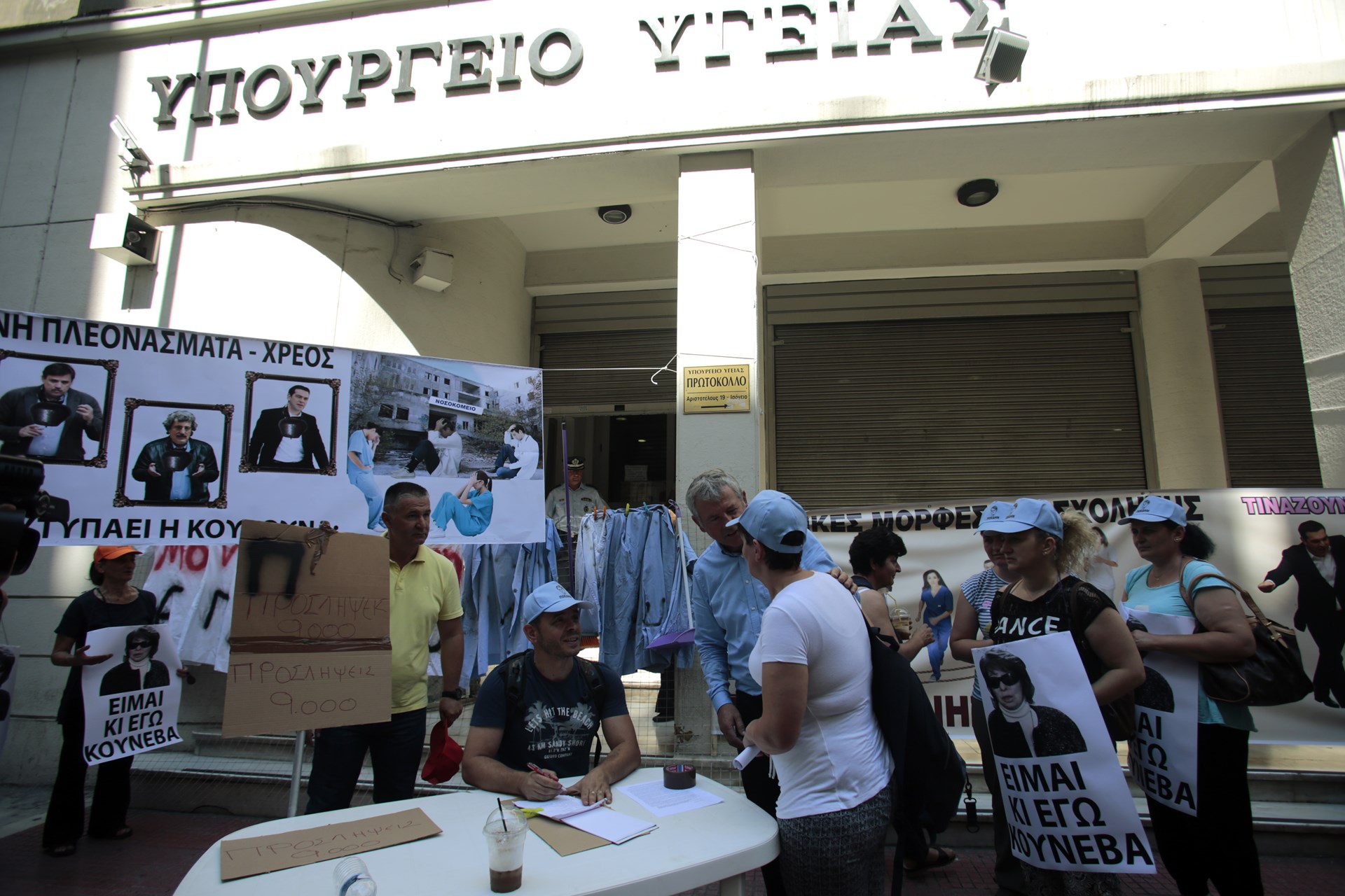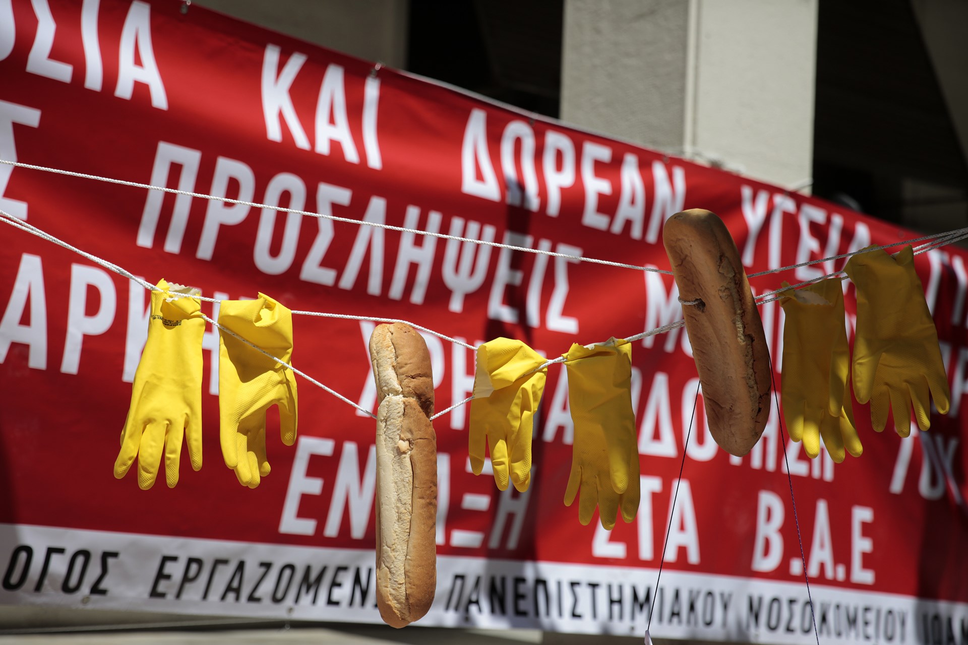 Συγκέντρωση διαμαρτυρίας έξω από το υπουργείο Υγείας πραγματοποίησαν το πρωί της Τετάρτης τα μέλη της ΠΟΕΔΗΝ, όπου κρέμασαν κίτρινα γάντια και φρατζόλες.