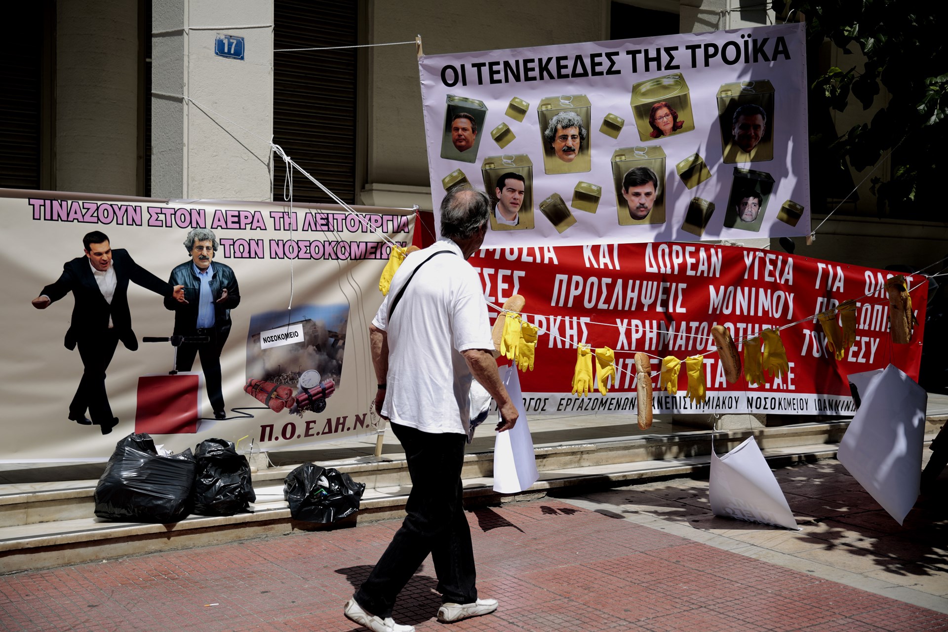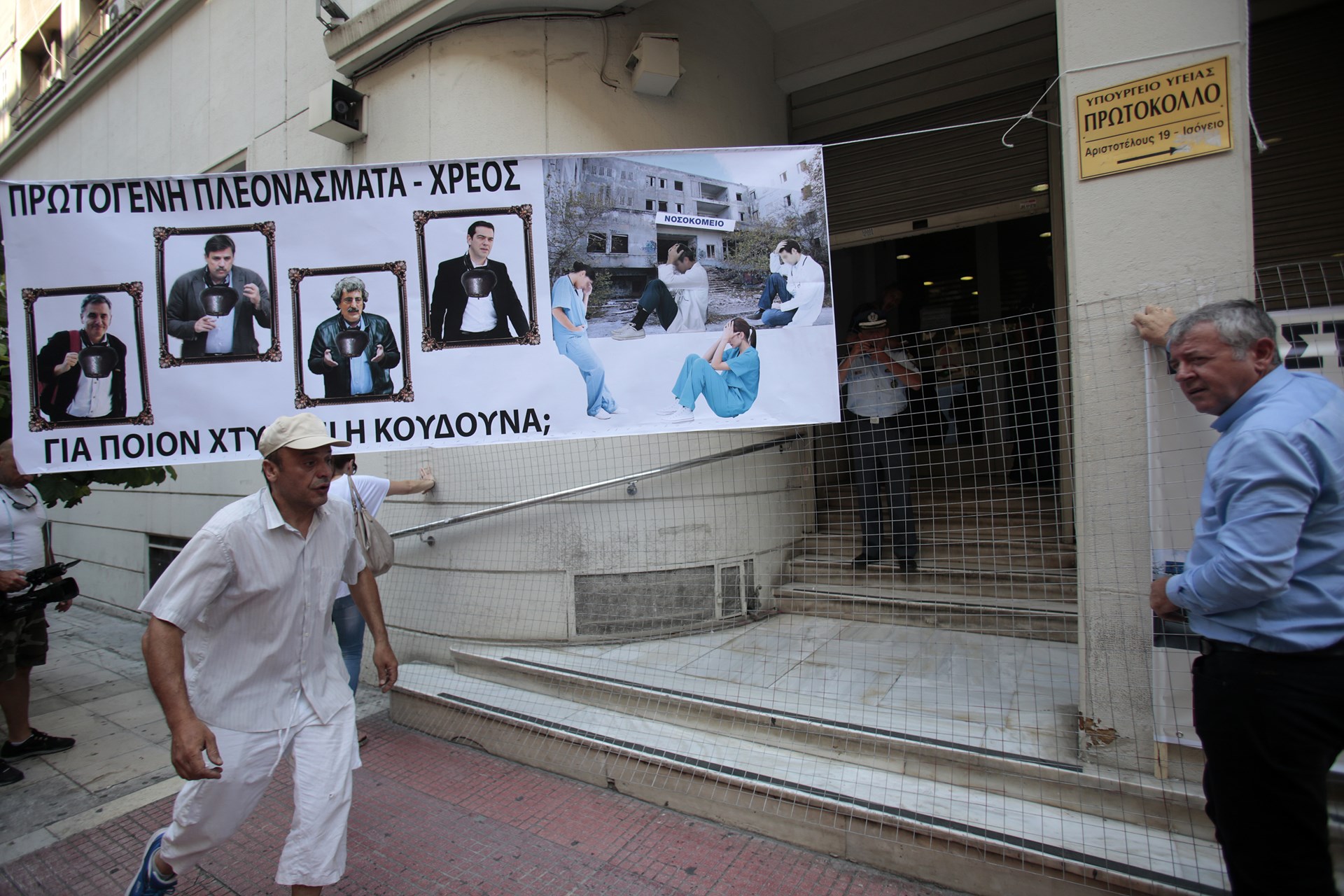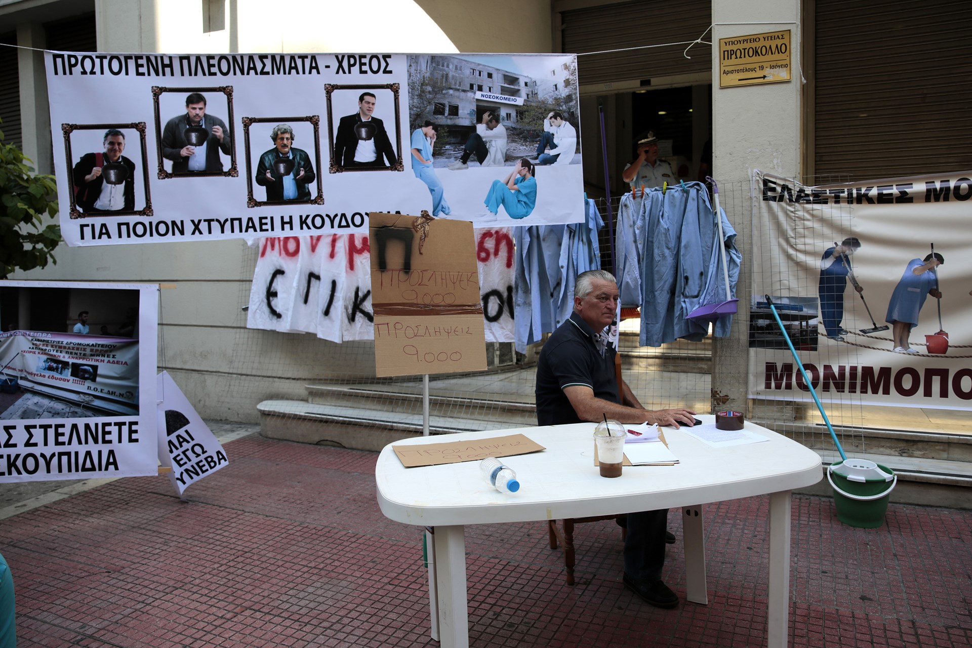 Συγκέντρωση διαμαρτυρίας έξω από το υπουργείο Υγείας πραγματοποίησαν το πρωί της Τετάρτης τα μέλη της ΠΟΕΔΗΝ, όπου κρέμασαν κίτρινα γάντια και φρατζόλες.