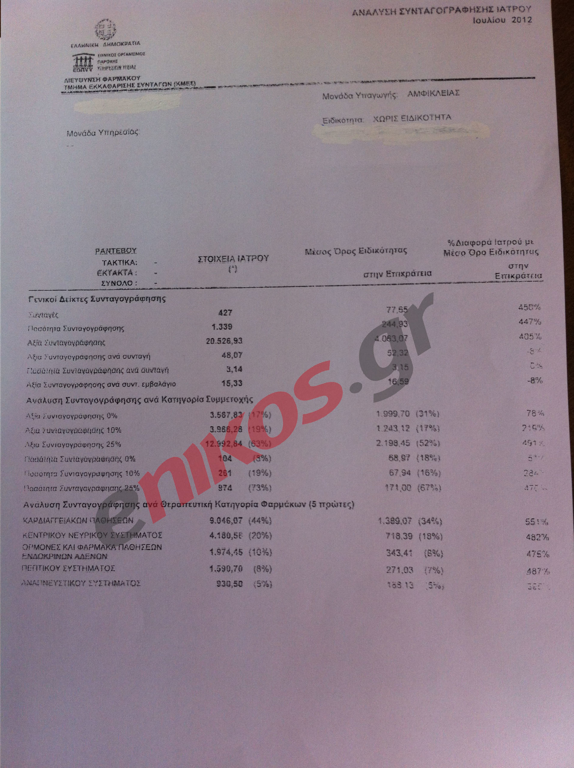 «Στις 31 Οκτωβρίου 2012 έγινε παρατήρηση – επίπληξη από τον ΕΟΠΠΥ σε τρεις αγροτικούς ιατρούς που ανήκουν στο Κέντρο Υγείας Αμφίκλειας για υπερσυνταγογράφηση.