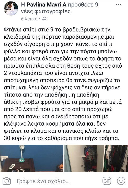«Φτάνω σπίτι στις 9 το βράδυ. Βρίσκω την κλειδαριά της πόρτας παραβιασμένη. Είμαι σχεδόν σίγουρη ότι μου έχουν κάνει το σπίτι φύλλο και φτερό. Ανοίγω την πόρτα μπαίνω μέσα και είναι όλα σχεδόν όπως τα άφησα το πρωί, τα έπιπλα όλα στη θέση τους εκτός από 2 ντουλαπάκια που είναι ανοικτά. Λέω αποτυχημένη απόπειρα θα τανε. Συγυρίζω το σπίτι και λέω δεν ψάχνεις να δεις αν πήρανε τίποτα από την αποθήκη… η αποθήκη άθικτη. Κόβω φρούτα για τα μικρά μου και μετά από 20 λεπτά που είμαι στο σπίτι προχωρώ προς τα πάνω. Και συνειδητοποιώ ότι με κλέψανε. Λεφτά, κοσμήματα όλα. Και δεν φτάνει το κλάμα και ο πανικός κλαίω και τα 30 ευρώ για το καθάρισμα που πήγε τσάμπα».
