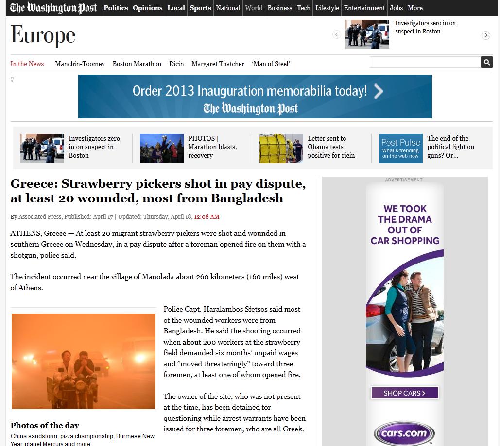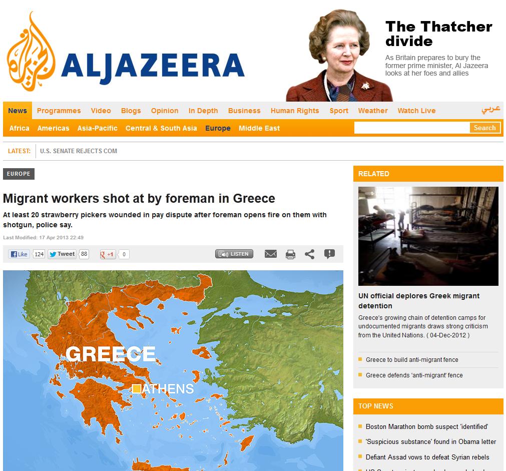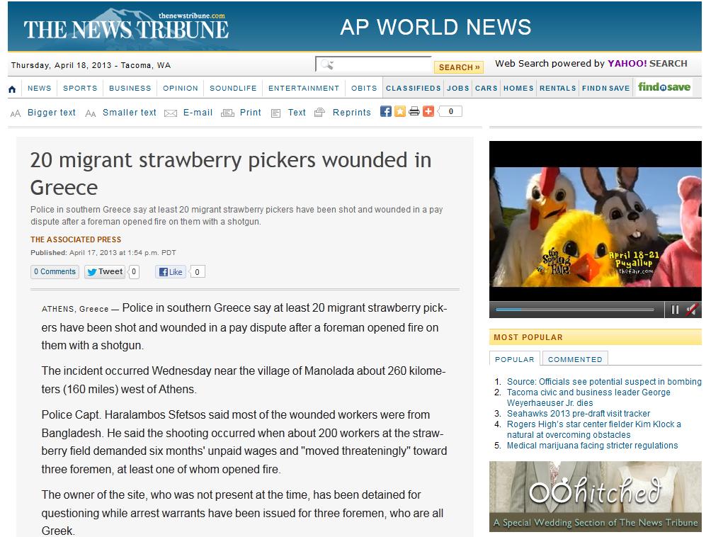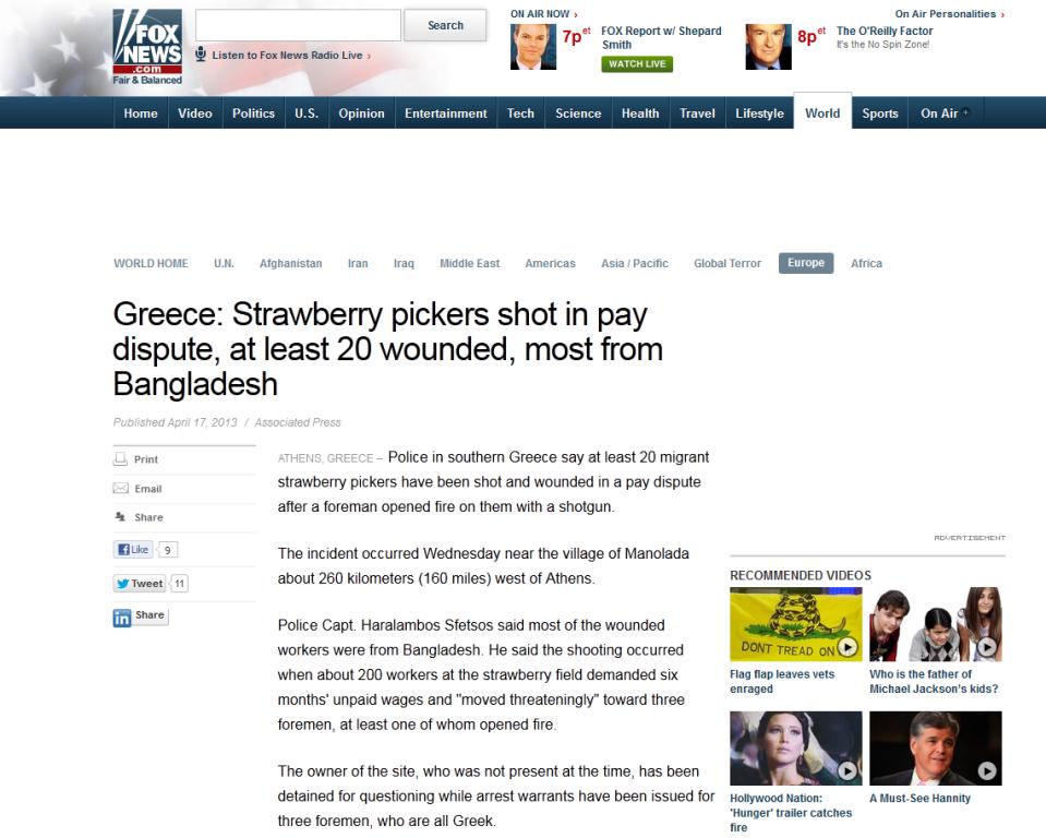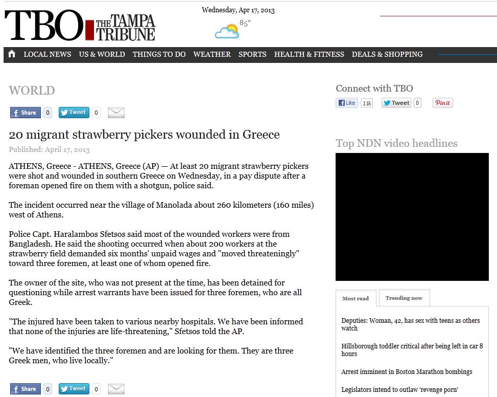 Το αιματηρό περιστατικό με τον τραυματισμό 28 αλλοδαπών εργατών στην Βουπρασία Νέας Μανωλάδας στην Ηλεία, από επιστάτες καλλιεργειών φράουλας, κάνει ήδη τον γύρο του κόσμου.