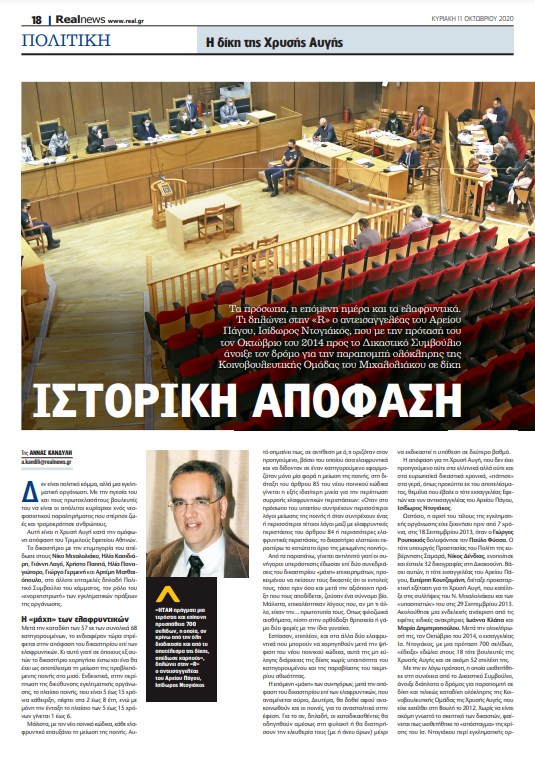 Δεν είναι πολιτικό κόμμα, αλλά μια εγκληματική οργάνωση. Με την ηγεσία του και τους πρωτοκλασάτους βουλευτές του να είναι οι απόλυτοι κυρίαρχοι ενός νεοφασιστικού παραληρήματος που στέρησε ζωές και τρομοκράτησε ανθρώπους. Αυτή είναι η Χρυσή Αυγή κατά την ομόφωνη απόφαση του Τριμελούς Εφετείου Αθηνών.