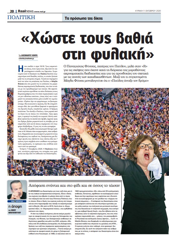 Ο Παύλος τον αποκαλούσε «µαστρο-Τάκη». Παναγιώτης Φύσσας: άνθρωπος ψηµένος από τη ζωή και τη δουλειά, ψύχραιµος, χαµηλών τόνων και λιγοµίλητος. Αφού συµφώνησε να µας µιλήσει, τον ρωτήσαµε γιατί πιστεύει ότι τα ηγετικά στελέχη της Χρυσής Αυγής απουσίαζαν από τη δικαστική αίθουσα. «Λογικό είναι που δεν εµφανίστηκαν στο δικαστήριο. Πιστεύω ότι φοβήθηκαν. Είναι και τόσος λαός έξω». Μετά από αυτό, οι ερωτήσεις δεν είχαν µεγάλη σηµασία και η ολιγόλεπτη συζήτηση ξεχείλισε από γενναιότητα και ευγνωµοσύνη. «Τα έχουµε ξαναπεράσει αυτά. Εχουν ξαναγίνει αυτά τα πράγµατα στην Ελλάδα, µε τη χούντα. Είναι τα παιδιά της χούντας που δικάστηκαν σήµερα», δήλωσε ο πατέρας του δολοφονηµένου µουσικού. Το βλέµµα του στράφηκε στον κόσµο. «Ηταν πολύς ο καιρός που κράτησε η δίκη και ήταν πολύς κόσµος στο πλάι µας. Και τους ευχαριστούµε όλους». Τόσον καιρό, η προσµονή για την απονοµή δικαιοσύνης δεν ήταν εύκολη υπόθεση. «Μιλάµε για 5,5 χρόνια δίκης και συνολικά για 7 χρόνια από τότε που έγινε το κακό. Και όντως ήταν πολύς κόσµος µαζί µας, αλλά δεν ήταν µόνο δική µας υπόθεση. Το ένιωσαν πολλοί ότι ήταν και δική τους υποχρέωση να είναι µαζί µας. Γιατί αύριο µπορεί να είναι κάποιου άλλου το παιδί. Γιατί αν δεν φύγει αυτό το καρκίνωµα, δεν ξέρεις ποιο παιδί θα έχει σειρά». Και πριν από την ανακοίνωση των ποινών είπε αυτό που θα ήθελε: «Τουλάχιστον οι σκληροπυρηνικοί θέλω να χωθούν βαθιά µέσα στη φυλακή». Παναγιώτης Φύσσας, ο πατέρας της νίκης επί της ναζιστικής και εγκληµατικής οργάνωσης.