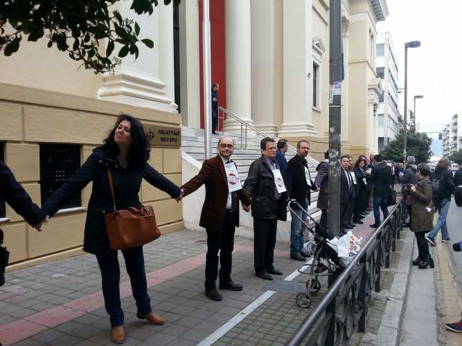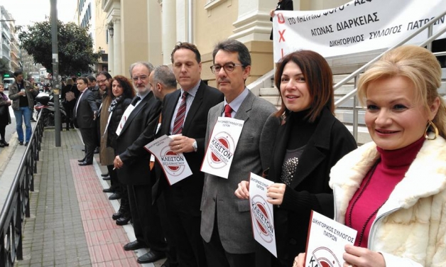 Μία ανθρώπινη αλυσίδα σχημάτισαν σήμερα το πρωί, γύρω από το δικαστικό μέγαρο της Πάτρας, τα μέλη του δικηγορικού συλλόγου της πόλης, προχωρώντας με αυτό τον τρόπο, σε συμβολικό αποκλεισμό των δικαστηρίων.