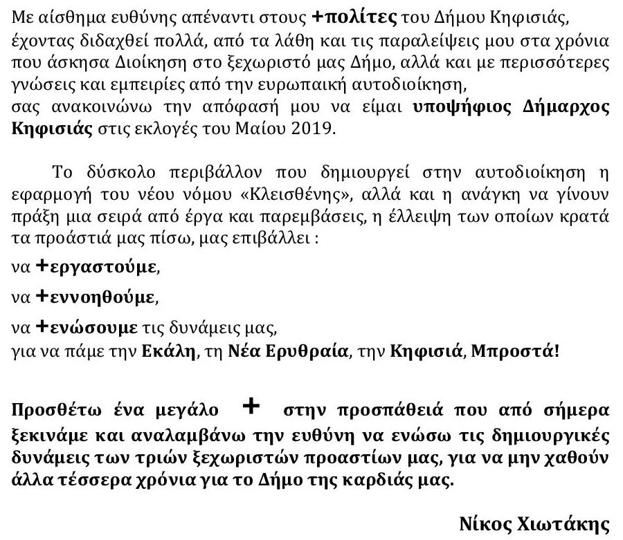 Διαβάστε την δήλωση υποψηφιότητας του Νίκου Χιωτάκη για το Δήμο Κηφισιάς