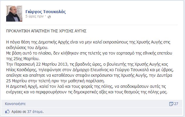 Την Παρασκευή 22 Μαρτίου 2013, τις βραδινές ώρες, ο βουλευτής της Χρυσής Αυγής κος Ηλίας Κασιδιάρης, τηλεφώνησε στον Δήμαρχο Ελευσίνας κο Γεώργιο Τσουκαλά και με ύβρεις, απείλησε και απαίτησε να καταθέσουν στεφάνι εκπρόσωποι της Χρυσής Αυγής, την Δευτέρα 25 Μαρτίου στην τελετή πριν την μαθητική παρέλαση.