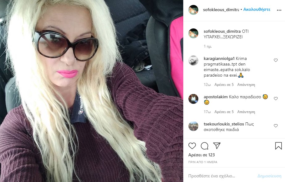 Θλίψη έχει προκαλέσει στη Θεσσαλονίκη ο ξαφνικός χαμός της Δήμητρας Σοφοκλέους σε τροχαίο δυστύχημα. Οι φίλοι της την αποχαιρετούν στα social media. Κάτω από τις φωτογραφίες που είχε δημοσιεύσει στο instagram και ειδικά στην τελευταία ανάρτησή της, που είχε γίνει λίγες ώρες πριν τον ξαφνικό θάνατό της, φίλοι και γνωστοί λένε το τελευταίο “αντίο”.