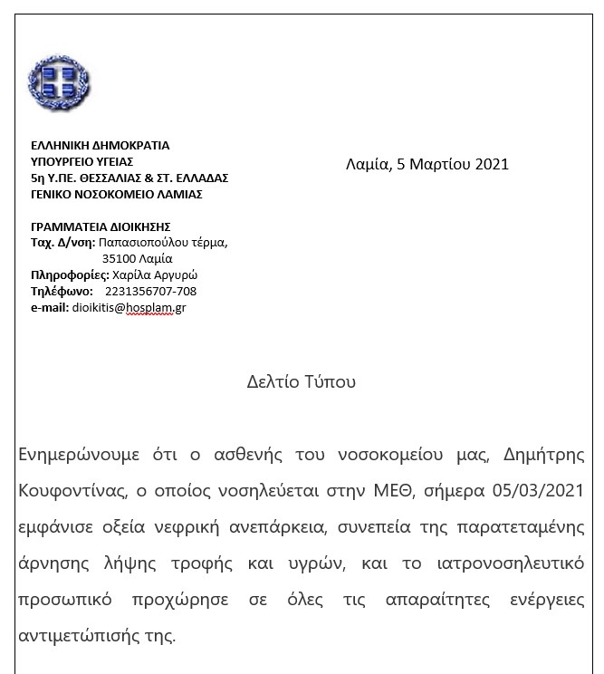Νέα επιδείνωση παρουσίασε η υγεία του Δημήτρη Κουφοντίνα, ο οποίος συνεχίζει να νοσηλεύεται στη Μονάδα Εντατικής Θεραπείας του νοσοκομείου Λαμίας. “Ενημερώνουμε ότι ο ασθενής του νοσοκομείου μας, Δημήτρης Κουφοντίνας, ο οποίος νοσηλεύεται στην ΜΕΘ, σήμερα 05/03/2021 εμφάνισε οξεία νεφρική ανεπάρκεια, συνεπεία της παρατεταμένης άρνησης λήψης τροφής και υγρών, και το ιατρονοσηλευτικό προσωπικό προχώρησε σε όλες τις απαραίτητες ενέργειες αντιμετώπισής της” αναφέρει η ανακοίνωση του νοσοκομείου Λαμίας που υπογράφει ο Διοικητής Ανδρέας Κολοκυθάς.
