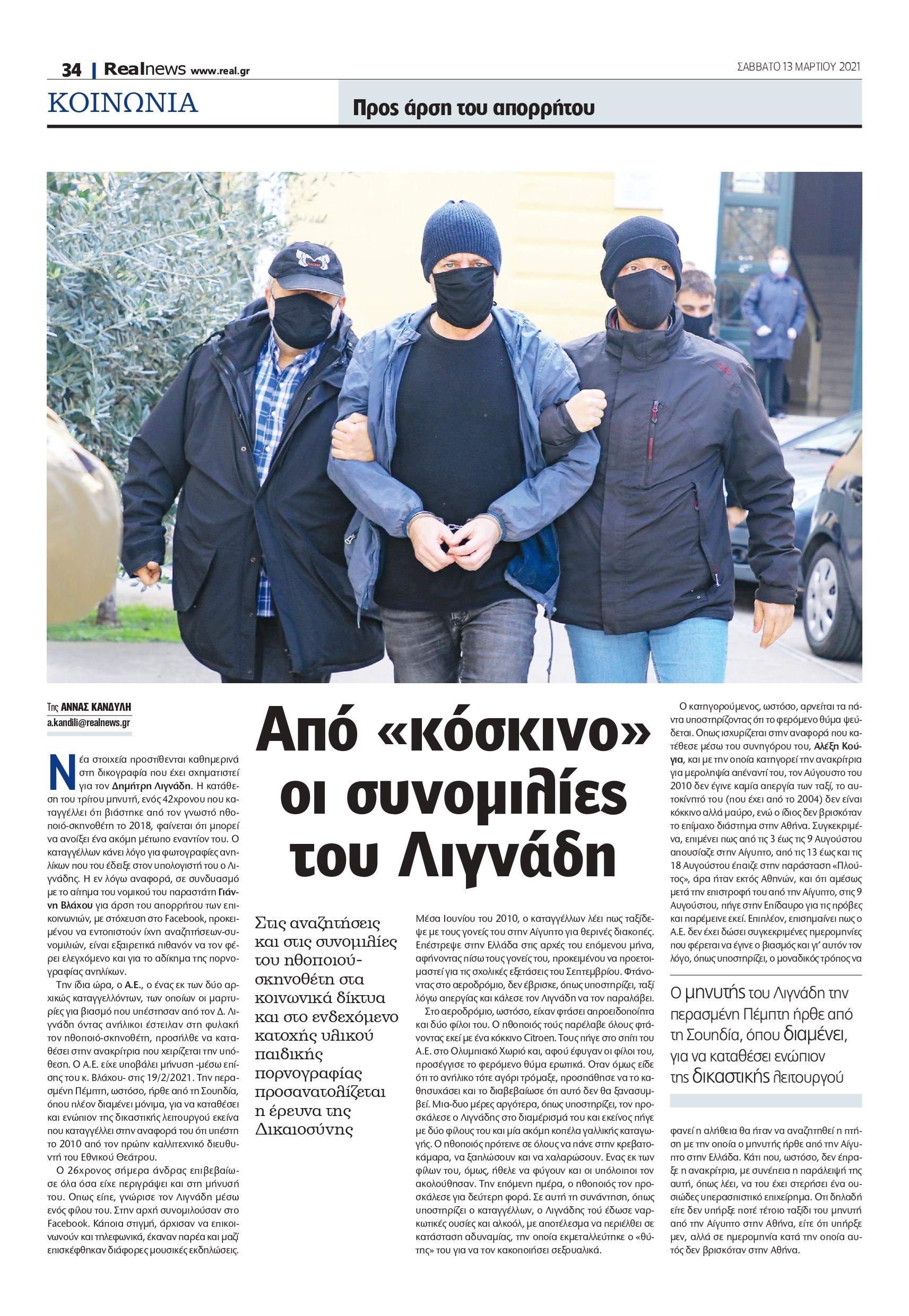 Την ίδια ώρα, ο Α.Ε., ο ένας εκ των δύο αρχικώς καταγγελλόντων, των οποίων οι μαρτυρίες για βιασμό που υπέστησαν από τον Δ. Λιγνάδη όντας ανήλικοι έστειλαν στη φυλακή τον ηθοποιό-σκηνοθέτη, προσήλθε να καταθέσει στην ανακρίτρια που χειρίζεται την υπόθεση. Ο Α.Ε. είχε υποβάλει μήνυση -μέσω επίσης του κ. Βλάχου- στις 19/2/2021. Την περασμένη Πέμπτη, ωστόσο, ήρθε από τη Σουηδία, όπου πλέον διαμένει μόνιμα, για να καταθέσει και ενώπιον της δικαστικής λειτουργού εκείνα που καταγγέλλει στην αναφορά του ότι υπέστη το 2010 από τον πρώην καλλιτεχνικό διευθυντή του Εθνικού Θεάτρου.