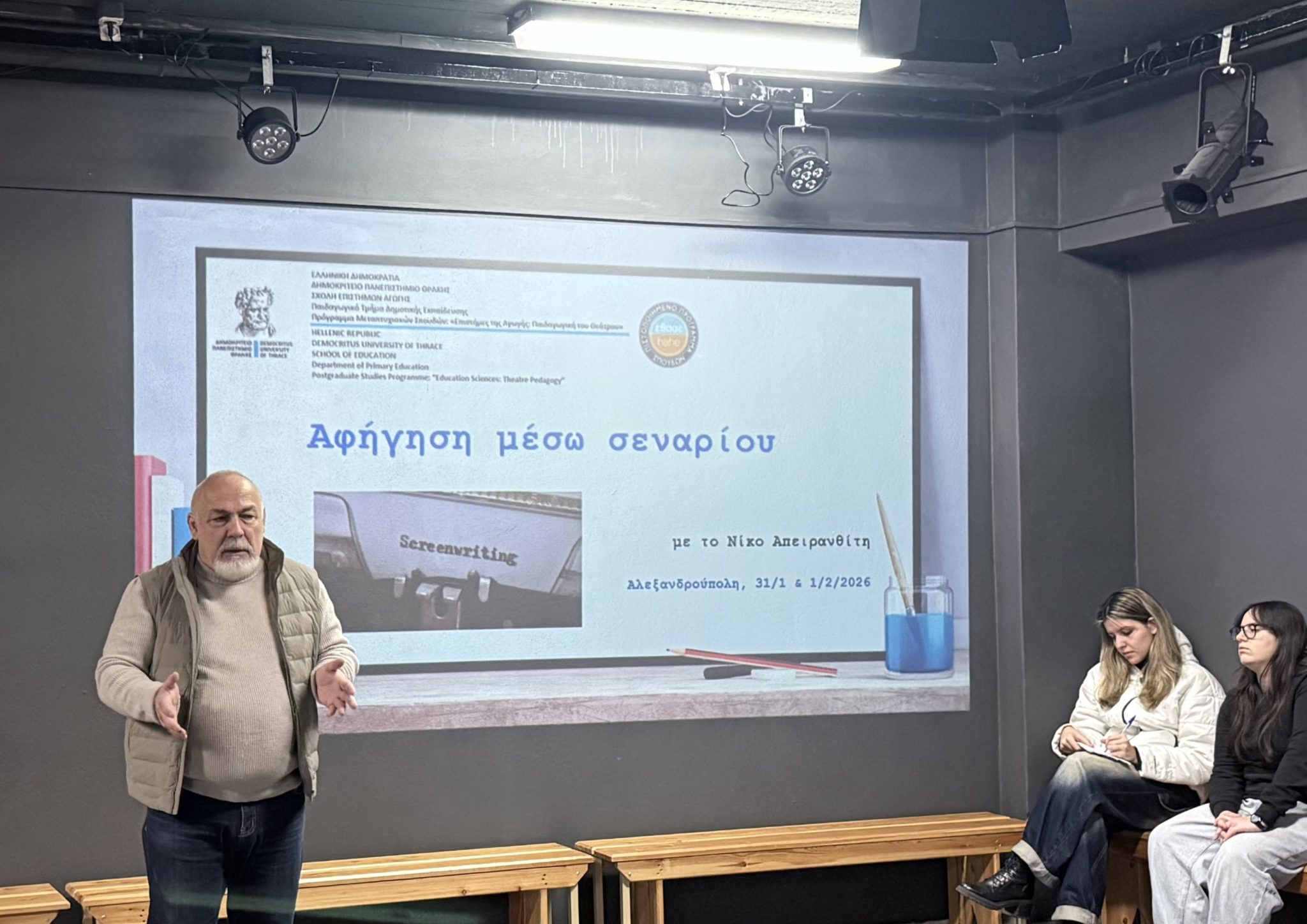 Το Πρόγραμμα Μεταπτυχιακών Σπουδών του Παιδαγωγικού Τμήματος Δημοτικής Εκπαίδευσης του Δημοκριτείου Πανεπιστημίου Θράκης με τίτλο: «Επιστήμες της Αγωγής: Παιδαγωγική του Θεάτρου (Education Sciences: Theatre Pedagogy)» ολοκλήρωσε με επιτυχία το πρώτο εξάμηνο του κύκλου 2025-2027, με μαθήματα από τους Τηλέμαχο Μουδατσάκι, Ομότιμο Καθηγητή του Πανεπιστημίου Κρήτης – Σκηνοθέτη και Νίκο Απειρανθίτη, Σεναριογράφο.