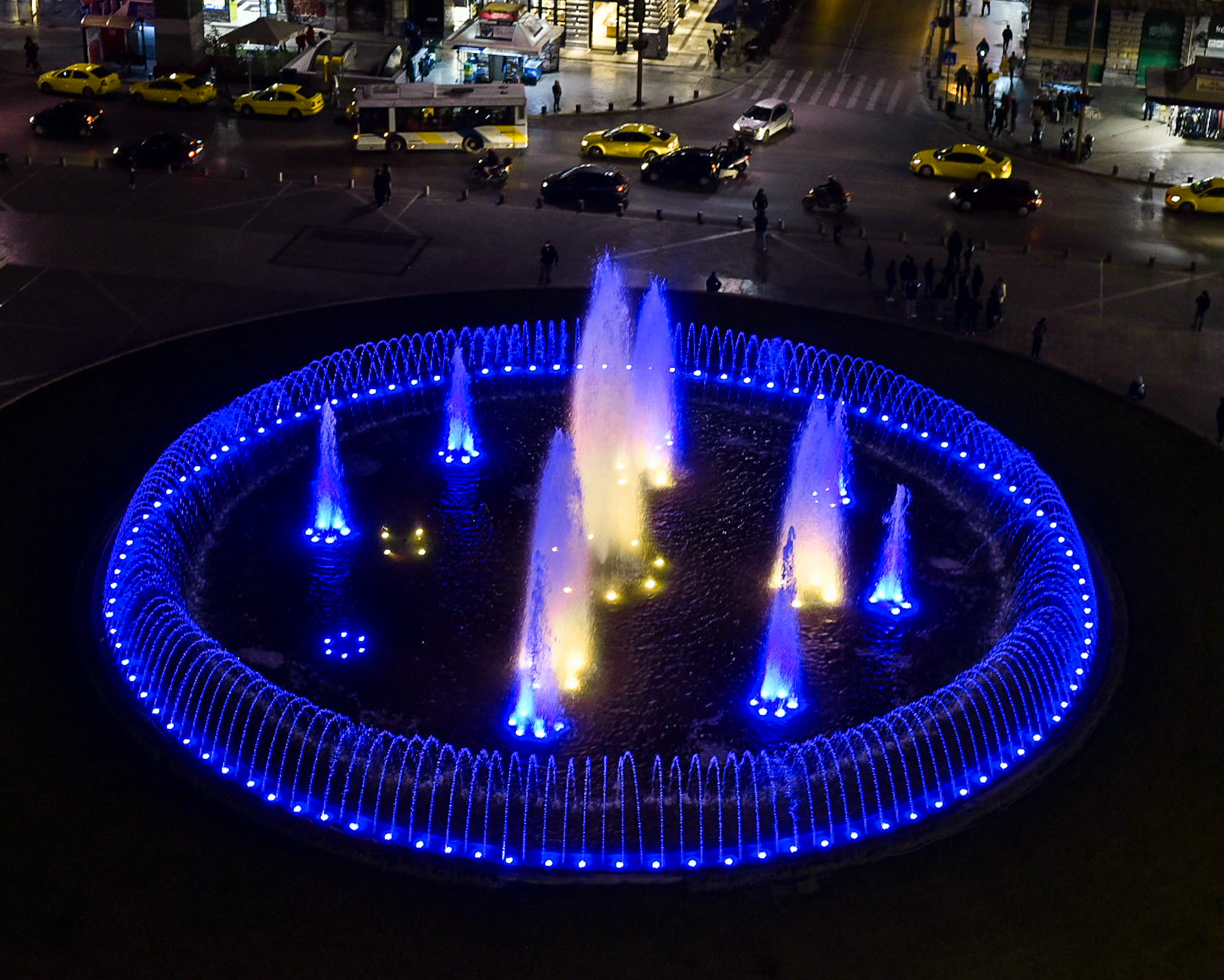 Στα χρώματα της ουκρανικής σημαίας φωταγωγήθηκε το βράδυ της Παρασκευής 25 Φεβρουαρίου, το σιντριβάνι της πλατείας Ομονοίας και το κτίριο της Τεχνόπολης.