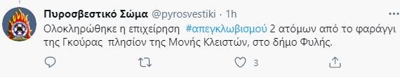 Ολοκληρώθηκε με επιτυχία ο απεγκλωβισμός δύο ανθρώπων από το ρέμα της Γκούρας σύμφωνα με την ενημέρωση της Πυροσβεστικής, Η επιχείρηση έγινε πλησίον της Μονής Κλειστών, στο δήμο Φυλής.