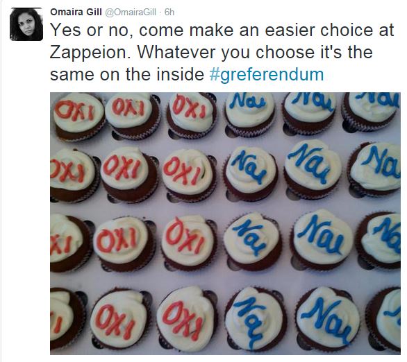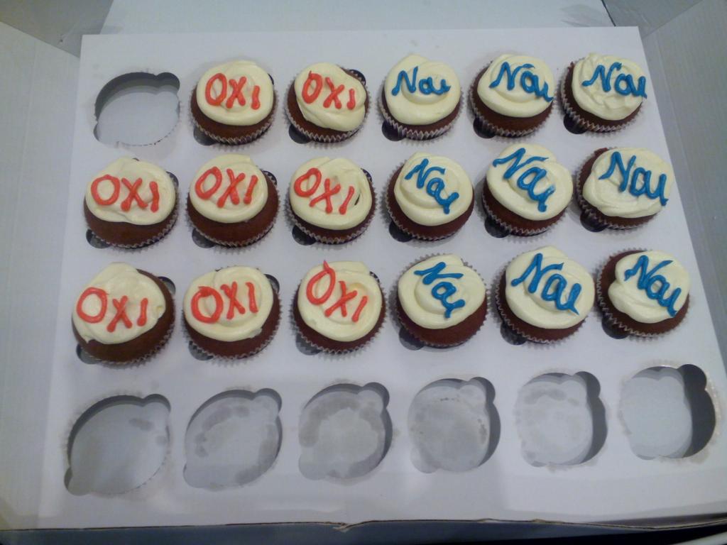 Η δημοσιογράφος Ομίρα Γκιλ, που γράφει στα: USAToday, BBCWorld, TheNationalUAE, KhaleejTimes, InsideMarine και InsideOilandGas, έφτιαξε τα cupcakes του δημοψηφίσματος με λευκό γλάσο, όπου πάνο αναγράφονταν με μπλε το «Ναι» και με κόκκινο το «Όχι».