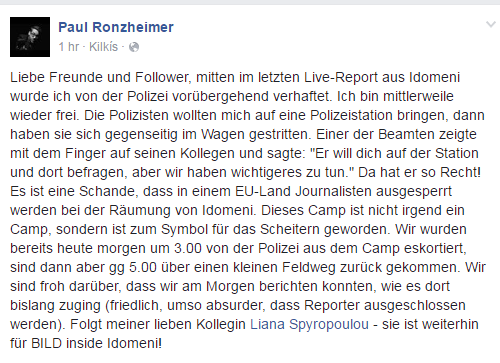 Κάποιοι δημοσιογράφοι κατάφεραν με διάφορους τρόπους να παραμείνουν στην Ειδομένη. Μεταξύ αυτών και ο δημοσιογράφος της Bild Paul Ronzheimer, ο οποίος παρέμεινε κρυμμένος σε ένα σημείο και από εκεί κατέγραψε την εξέλιξη της επιχείρησης.