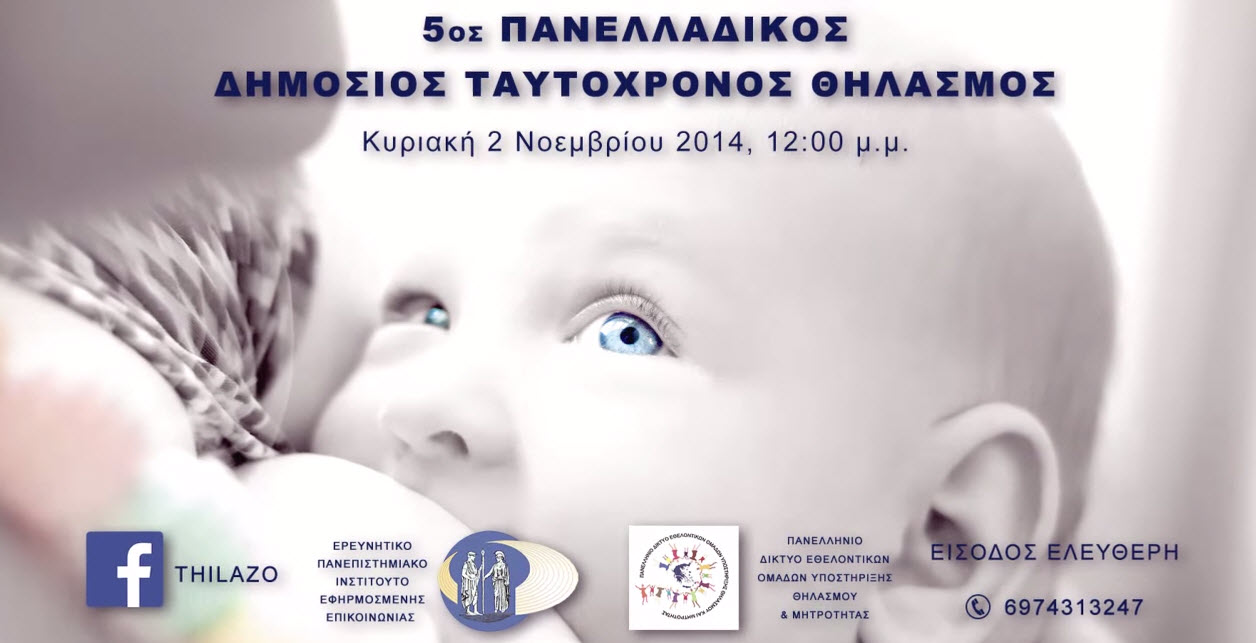 Με στόχο την απενοχοποίηση του δημόσιου θηλασμού και την εξοικείωση της κοινωνίας μας με την εικόνα της θηλάζουσας μητέρας διοργανώνεται ο 5ος πανελλαδικός ταυτόχρονος δημόσιος μητρικός θηλασμός σε 50 πόλεις της Ελλάδας, στο πλαίσιο του εορτασμού της Παγκόσμιας Εβδομάδας Μητρικού Θηλασμού (1-7 Νοεμβρίου).