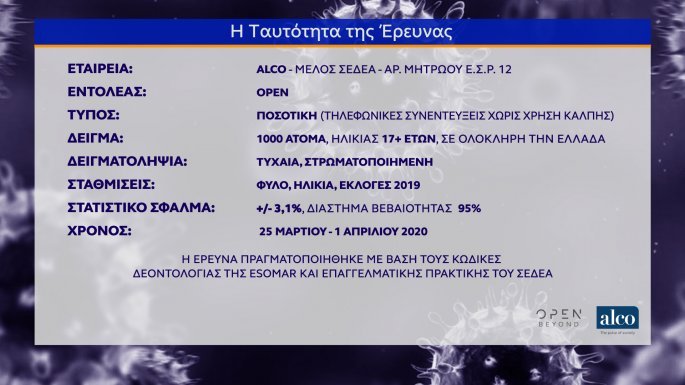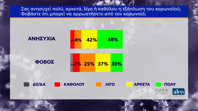 Ανήσυχοι και φοβισμένοι παρουσιάζονται οι πολίτες σχετικά με τον κορονοϊό σύμφωνα με δημοσκόπηση της Alco για λογαριασμό του Open. Στη δημοσκόπηση που πραγματοποίησε η εταιρεία ALCO το 90% των ερωτηθέντων ανησυχεί για την εξάπλωση της πανδημίας, ενώ το 67% φοβάται ότι θα νοσήσει από τον ιό.