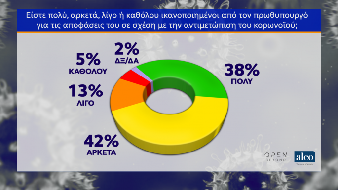 Το 86% θεωρούν ότι η κυβέρνηση έλαβε μέτρα εγκαίρως, ενώ δηλώνουν ικανοποιημένοι με τις αποφάσεις του Κυριάκου Μητσοτάκη και του Βασίλη Κικίλια για την αντιμετώπιση του κορονοϊού. Αντιθέτως, βρίσκουν ανεπαρκή τα μέτρα οικονομικής στήριξης των εργαζομένων και των επιχειρήσεων.