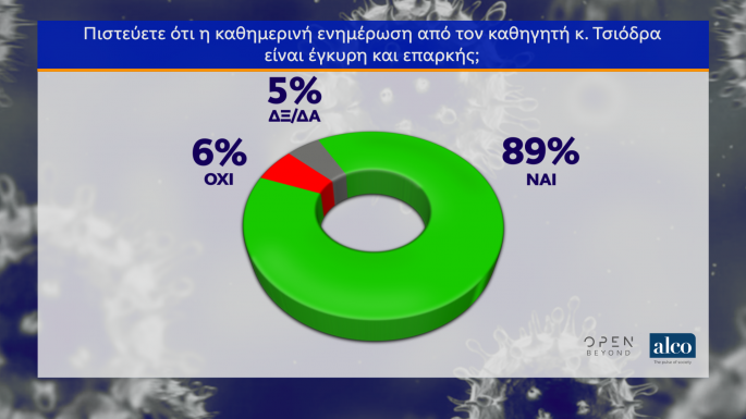 Το 89% την κρίνει ως επαρκή και έγκυρη την καθημερινή ενημέρωση από τον καθηγητή Σωτήρη Τσιόδρα, ενώ μόλις το 6% ως ανεπαρκή και το υπόλοιπο ποσοστό δεν απαντά.