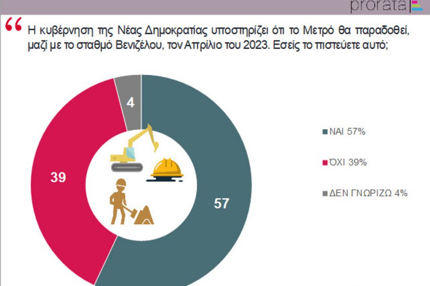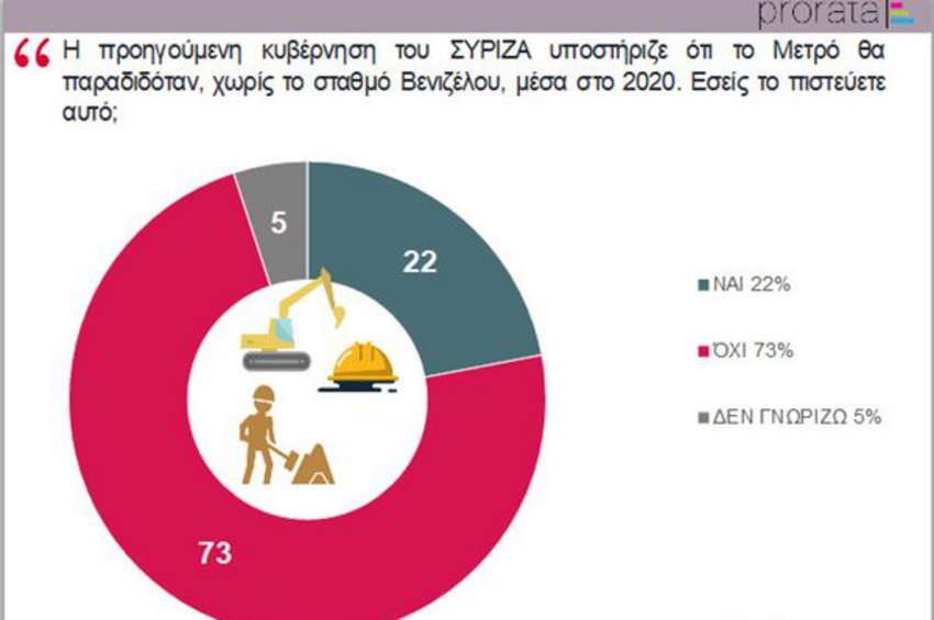 -Το 57% δηλώνει ότι πιστεύει τη σημερινή κυβέρνηση ότι το έργο θα παραδοθεί, μαζί με τον σταθμό Βενιζέλου τον Απρίλιο του 2023. Ενώ σε αντίστοιχο ερώτημα, μόνο το 22% δηλώνει ότι πιστεύει την προηγούμενη κυβέρνηση ότι το έργο θα παραδιδόταν, χωρίς τον σταθμό Βενιζέλου, μέσα στο 2020 (ενώ το 73% πιστεύει το αντίθετο).