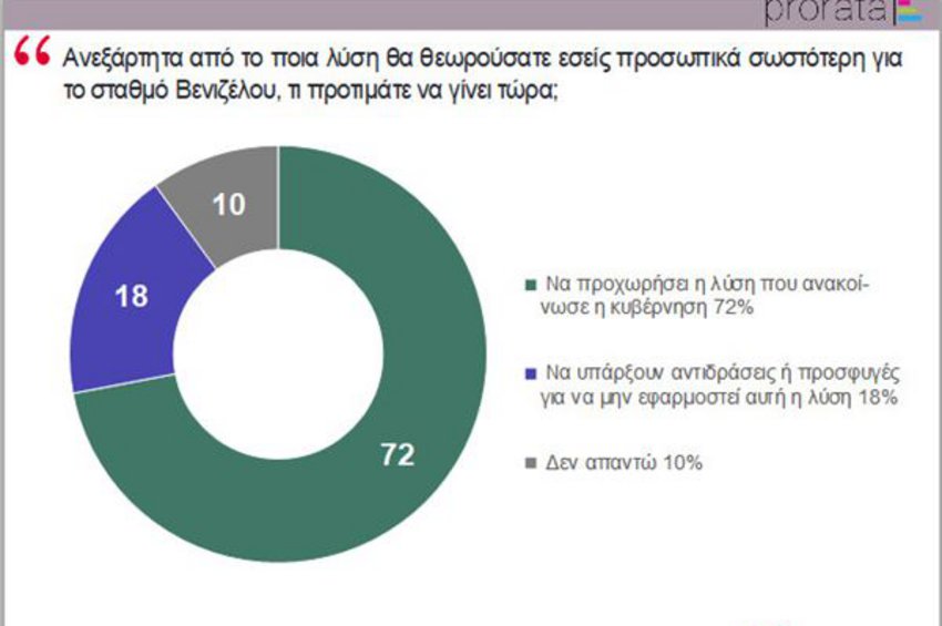 Στη σημαντικότερη ίσως ερώτηση της έρευνας, που αποτυπώνει το κλίμα και την κυρίαρχη τάση στην πόλη για το θέμα του μετρό, το 72% των Θεσσαλονικέων, δηλαδή σχεδόν τρεις στους τέσσερις, απαντούν ότι ανεξάρτητα από το ποια λύση θα θεωρούσαν σωστότερη οι ίδιοι για το σταθμό Βενιζέλου, αυτό που προτιμούν τώρα είναι να προχωρήσει η λύση που ανακοίνωσε η κυβέρνηση. Υπέρ αντιδράσεων για να μην εφαρμοστεί αυτή η λύση τάσσεται το 18%, ενώ το 10% δεν απαντά.