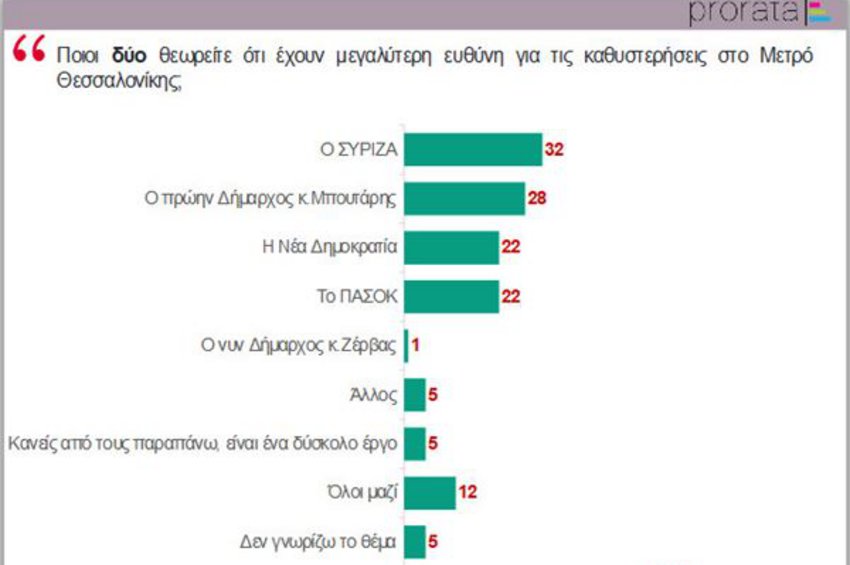 Οι πολίτες όμως δεν διστάζουν να επιρρίψουν και ευθύνες για τα όσα έγιναν. Ως προς την κατανομή ευθυνών για τις καθυστερήσεις μέχρι σήμερα στην ολοκλήρωση του έργου, οι ερωτώμενοι (είχαν δυνατότητα έως δύο επιλογών σε αυτή την ερώτηση) αποδίδουν ευθύνες στον ΣΥΡΙΖΑ (32%) και τον κ. Μπουτάρη (28%) και στη συνέχεια σε ΠΑΣΟΚ και Νέα Δημοκρατία (από 22%). Την επιλογή «όλοι μαζί», διάλεξε ένα ποσοστό 12%. Αν αυτό συνδυαστεί με το υψηλότατο ποσοστό 73% που απαντά ότι δεν πίστεψε τις εξαγγελίες της προηγούμενης κυβέρνησης περί λειτουργίας του μετρό, χωρίς το σταθμό Βενιζέλου, τότε έχουμε ένα δείγμα της αναξιοπιστίας και της αφερεγγυότητας που θεωρούν οι πολίτες ότι διατρέχει τις εξαγγελίες για το σημαντικότερο σύγχρονο έργο υποδομής στη Θεσσαλονίκη.