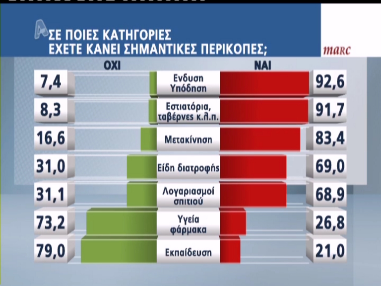 Ταυτόχρονα, οι περικοπές σε αρκετές κατηγορίες, όπως την ένδυση και την υπόδηση είναι αρκετά υψηλες στα ποσοστά, έχοντας πιο σημαντική προτεραιότητα φυσικά, την υγεία και την εκπαίδευση.