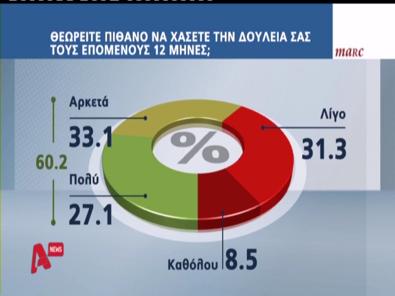 Συγκεκριμένα, σύμφωνα με τη δημοσκόπηση, το 33,1 % των ερωτηθέντων θεωρούν αρκετά πιθανόν να χάσουν τη δουλειά τους επόμενους 12 μήνες, ενώ το 27,1% το θεωρεί πολύ πιθανόν. Είναι χαρακτηριστικό ότι μόλις το 8,5% των ερωτηθέντων εμφανίζονται σίγουροι για την εργασία τους.