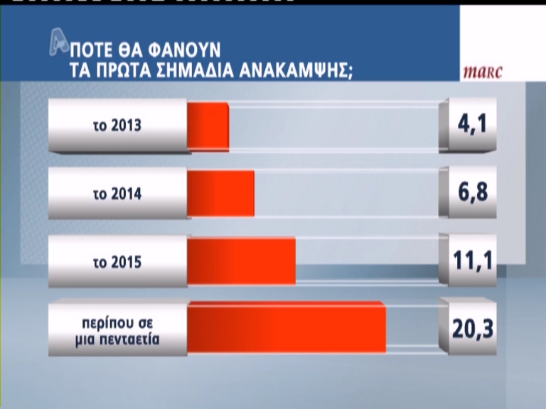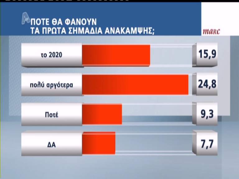 Για πολύ αργότερα διακρίνουν τα πρώτα σημάδια ανάκαμψης, σχεδόν ένας στους τέσσερις Έλληνες, σε σχετική ερώτηση με το πότε πιστεύουν πως θα αλλάξει η εικόνα της οικονομίας. Ενώ συνολικά ένα ποσοστό πάνω απο 35% πιστεύει πως αυτό θα συμβεί απο 5 χρόνια και περισσότερο.