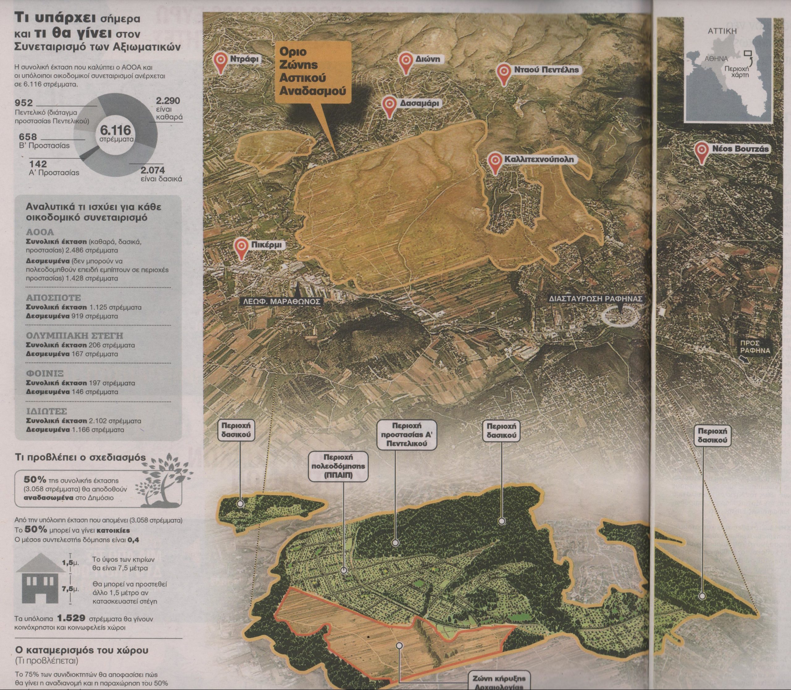 Η δυσκολία αυτής της περίπτωσης έγκειται στο γεγονός ότι συνυπάρχουν πολλά και διαφορετικά καθεστώτα: στην έκταση των 6.116 στρεμμάτων-όση είναι περίπου η έκτση του Ελληνικού- βρίσκεται η Ζώνη Αστικού Αναδασμού Πικερμίου Ραφήνας, η Α’ Ζώνη Προστασίας Πεντελικού, η Α΄ Ζώνη Προστασίας Αρχαιολογίας και οι δασικές εκτάσεις.