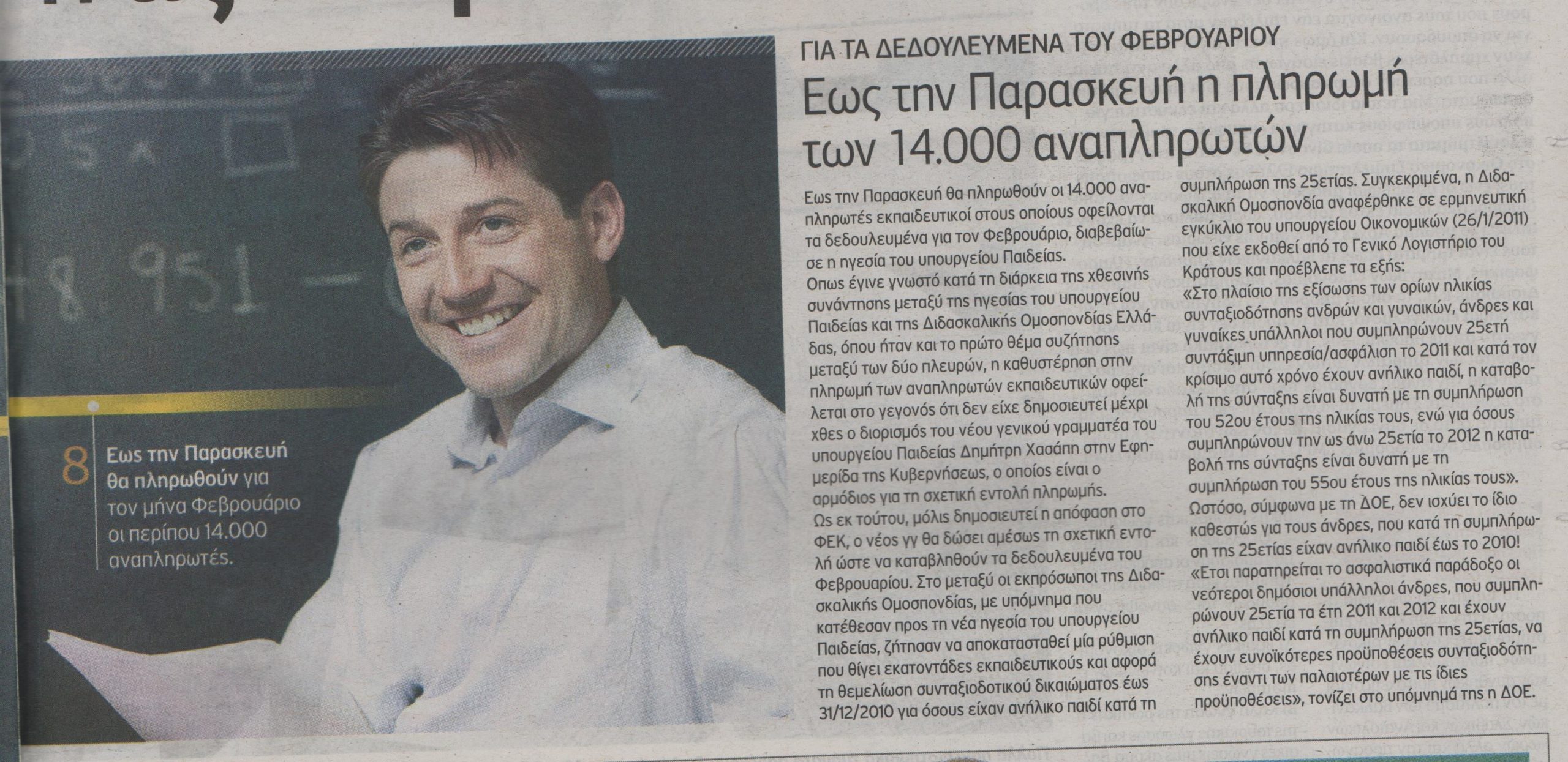 Χθες η πολιτική ηγεσία του υπουργείου Παιδείας (κ. Μπαλτάς και Κουράκης) κατά τη διάρκεια της συνάντησης που είχε με τους εκπροσώπους της Διδασκαλικής Ομοσπονδίας έδωσε απαντήσεις στα κρίσιμα ζητήματα που έθεσαν οι εκπαιδευτικοί και ταυτόχρονα ξεκαθάρισε ότι τα οικονομικά αιτήματα του κλάδου δεν θα ικανοποιηθούν άμεσα, αφού όπως χαρακτηριστικά είπε «πρέπει πρώτα να ξεπεράσουμε τον κάβο του τετραμήνου».
