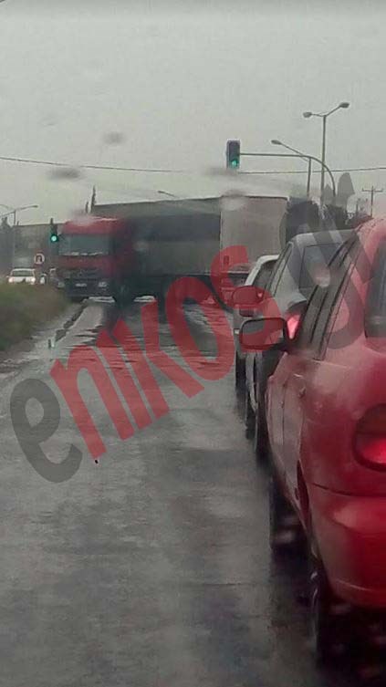 Κυκλοφοριακό κομφούζιο προκλήθηκε στη Χαλκηδόνα στη Θεσσαλονίκη όταν μια νταλίκα δίπλωσε λόγω της ολισθηρότητας του δρόμου. Αναγνώστης του enikos.gr αναφέρει πως χρειάστηκε να παραμείνει για περισσότερη από μια ώρα στο σημείο καθώς ο δρόμος είχε κλείσει από το βαρύ όχημα και κανείς δεν το είχε απομακρύνει.