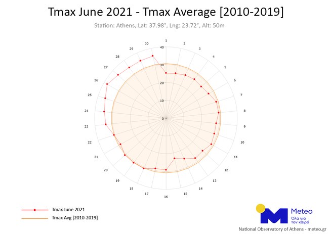 Το επόμενο σχήμα δείχνει την πορεία της μέγιστης θερμοκρασίας τον Ιούνιο του 2021 στο κέντρο της Αθήνας (κόκκινη καμπύλη) και τις μέσες τιμές της μέγιστης θερμοκρασίας στον ίδιο σταθμό (Γκάζι) την περίοδο 2010-2019. Καθένας από τους αριθμούς στην περιφέρεια του κύκλου αντιστοιχεί στις ημέρες του μήνα και οι ακτίνες αντιστοιχούν σε θερμοκρασίες από 0°C έως 40°C με βήμα 10°C. Το πρώτο μισό του μήνα μεταξύ 1 και 17 Ιουνίου η μέγιστη θερμοκρασία ήταν καθημερινά χαμηλότερη από τις φυσιολογικές για την εποχή τιμές, ενώ μεταξύ 23 και 30 Ιουνίου η θερμοκρασία ήταν συνεχώς πολύ πάνω από τον μέσο όρο της περιόδου 2010-2019. Παρόμοια κατανομή των ημερήσιων θερμοκρασιών καταγράψαμε και στους υπόλοιπους 51 μετεωρολογικούς σταθμούς.