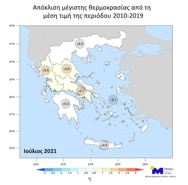 Στη Μακεδονία και την Κρήτη η μέση μέγιστη θερμοκρασία υπολογίστηκε ακριβώς ίση με τον μέσο όρο της περιόδου 2010-2019, ενώ στην υπόλοιπη ηπειρωτική χώρα οι αντίστοιχες τιμές ήταν ελαφρώς υψηλότερες, μικρότερες όμως από ένα βαθμό Κελσίου πάνω από τα κανονικά για την εποχή επίπεδα. Στα νησιά του Αιγαίου καταγράφηκε μικρή αρνητική απόκλιση -0,1 βαθμού.