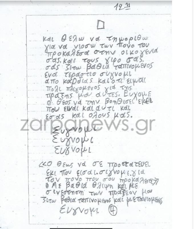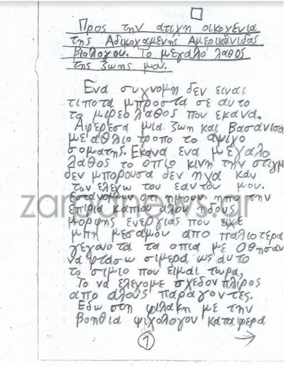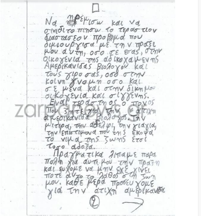 Τον Αύγουστο του 2019, έναν μήνα μετά τη φρικτή δολοφονία της Σούζαν Ίτον, ο Γιάννης Παρασκάκης έγραψε ένα γράμμα στην οικογένεια της βιολόγου μέσα από τις φυλακές της Τρίπολης σύμφωνα με το zarpanews.gr. Απευθύνεται στην οικογένεια της αδικοχαμένης Αμερικανίδας βιολόγου αναφερόμενος στο “μεγαλύτερο λάθος” της ζωής του και ζητάει συγγνώμη λέγοντας χαρακτηριστικά, πως δεν είχε τον έλεγχο του εαυτού του καθώς μια μορφή ενέργειας είχε μπει μέσα του. Το γράμμα προς την οικογένεια της Σούζαν Ίτον το έστειλε ο κατηγορούμενος από τη φυλακή μαζί με άλλα γράμματα προς την οικογένεια του, στο πατρικό του στο Μάλεμε Χανίων αλλά οι γονείς του αποφάσισαν να το κρατήσουν και να μην το στείλουν στην οικογένεια της Αμερικανίδας βιολόγου. Αυτό είναι ολόκληρο το γράμμα που έγραψε ο 28χρονος: