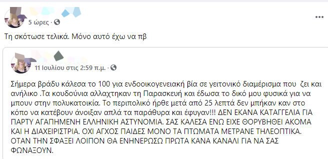 Αναλυτικά, είχε γράψει στις 11 Ιουλίου: “Σήμερα βράδυ κάλεσα το 100 για ενδοοικογενειακή βία σε γειτονικό διαμέρισμα που ζει και ανήλικο .Τα κουδούνια αλλαχτηκαν τη Παρασκευή και έδωσα το δικό μου φυσικά για να μπουν στην πολυκατοικία. Το περιπολικό ήρθε μετά από 25 λεπτά δεν μπήκαν καν στο κόπο να κατέβουν άνοιξαν απλά τα παράθυρα και έφυγαν!!! ΔΕΝ ΕΚΑΝΑ ΚΑΤΑΓΓΕΛΙΑ ΓΙΑ ΠΑΡΤΥ ΑΓΑΠΗΜΕΝΗ ΕΛΛΗΝΙΚΗ ΑΣΤΥΝΟΜΙΑ. ΣΑΣ ΚΑΛΕΣΑ ΕΝΩ ΕΙΧΕ ΘΟΡΥΒΗΘΕΙ ΑΚΟΜΑ ΚΑΙ Η ΔΙΑΧΕΙΡΙΣΤΡΙΑ. ΟΧΙ ΑΓΧΟΣ ΠΑΙΔΕΣ ΜΟΝΟ ΤΑ ΠΤΩΜΑΤΑ ΜΕΤΡΑΝΕ ΤΗΛΕΟΠΤΙΚΑ. ΟΤΑΝ ΤΗΝ ΣΦΑΞΕΙ ΛΟΙΠΟΝ ΘΑ ΕΝΗΝΕΡΩΣΩ ΠΡΩΤΑ ΚΑΝΑ ΚΑΝΑΛΙ ΓΙΑ ΝΑ ΣΑΣ ΦΩΝΑΞΟΥΝ”.