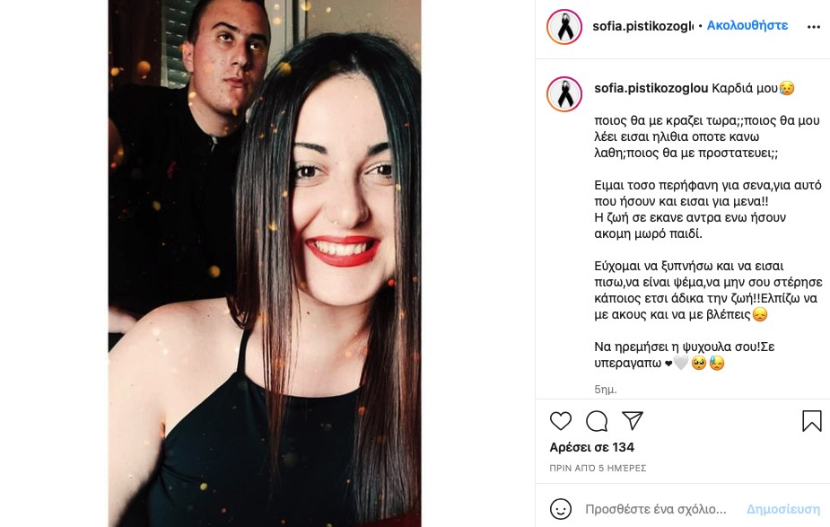 Σε μια άλλη φωτογραφία η αδελφή του 20χρονου γράφει: “Καρδιά μου, ποιος θα με κράζει τώρα;;; Ποιος θα μου λέει είσαι ηλίθια, όποτε κάνω λάθη; Ποιος θα με προστατεύει; Είμαι τόσο περήφανη για σένα, γι’ αυτό που ήσουν και είσαι για μένα! Η ζωή σε έκανε άντρα, ενώ ήσουν ακόμη μωρό παιδί. Εύχομαι να ξυπνήσω και να είσαι πίσω, να είναι ψέμα, να μην σου στέρησε κάποιος έτσι άδικα τη ζωή. Ελπίζω να με ακούς και να με βλέπεις. Να ηρεμήσει η ψυχούλα σου. Σε υπεραγαπώ”.