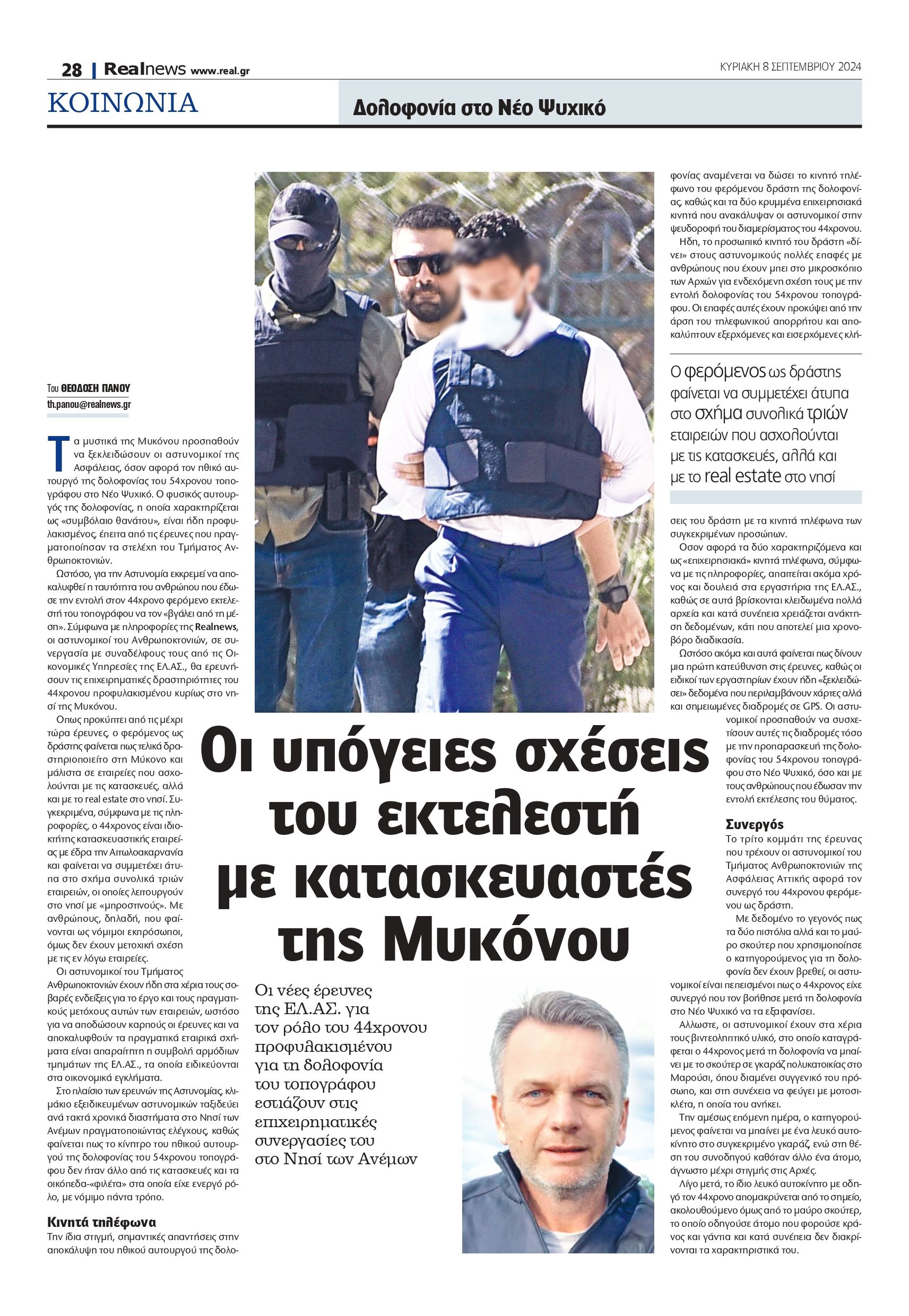 Τα μυστικά της Μυκόνου προσπαθούν να ξεκλειδώσουν οι αστυνομικοί της Ασφάλειας, όσον αφορά τον ηθικό αυτουργό της δολοφονίας του 54χρονου τοπογράφου στο Νέο Ψυχικό. Ο φυσικός αυτουργός της δολοφονίας, η οποία χαρακτηρίζεται ως «συμβόλαιο θανάτου», είναι ήδη προφυλακισμένος, έπειτα από τις έρευνες που πραγματοποίησαν τα στελέχη του Τμήματος Ανθρωποκτονιών.