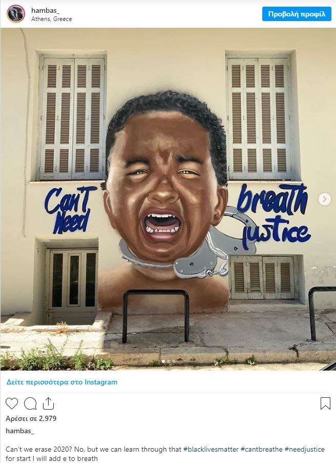 Στην τελευταία κατηγορία, λοιπόν ανήκει και η Ελλάδα. Ένα τέτοιο γκράφιτι κοσμεί τις τελευταίες ώρες έναν τοίχο στο Μεταξουργείο, του street artist Hambas. Σε αυτό, αναγράφονται οι φράσεις «Can’t breathe» (Δεν μπορώ να αναπνεύσω) και «Need Justice» (Χρειάζομαι Δικαιοσύνη).