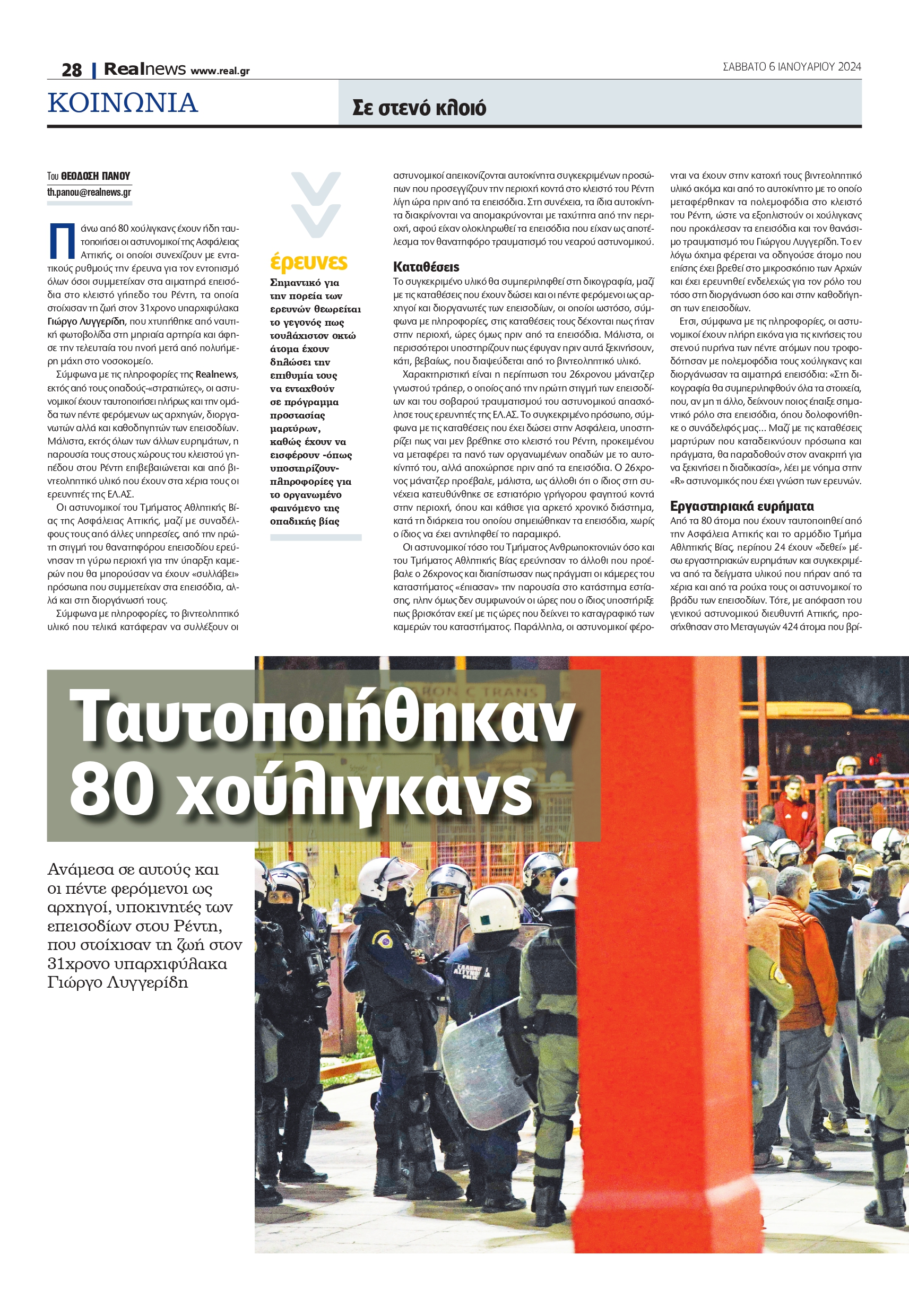 Πάνω από 80 χούλιγκαν έχουν ήδη ταυτοποιήσει οι αστυνομικοί της Ασφάλειας Αττικής, οι οποίοι συνεχίζουν με εντατικούς ρυθμούς την έρευνα για τον εντοπισμό όλων όσοι συμμετείχαν στα αιματηρά επεισόδια στο κλειστό γήπεδο του Ρέντη, τα οποία στοίχισαν τη ζωή στον 31χρονο υπαρχιφύλακα Γιώργο Λυγγερίδη, που χτυπήθηκε από ναυτική φωτοβολίδα στη μηριαία αρτηρία και άφησε την τελευταία του πνοή μετά από πολυήμερη μάχη στο νοσοκομείο.